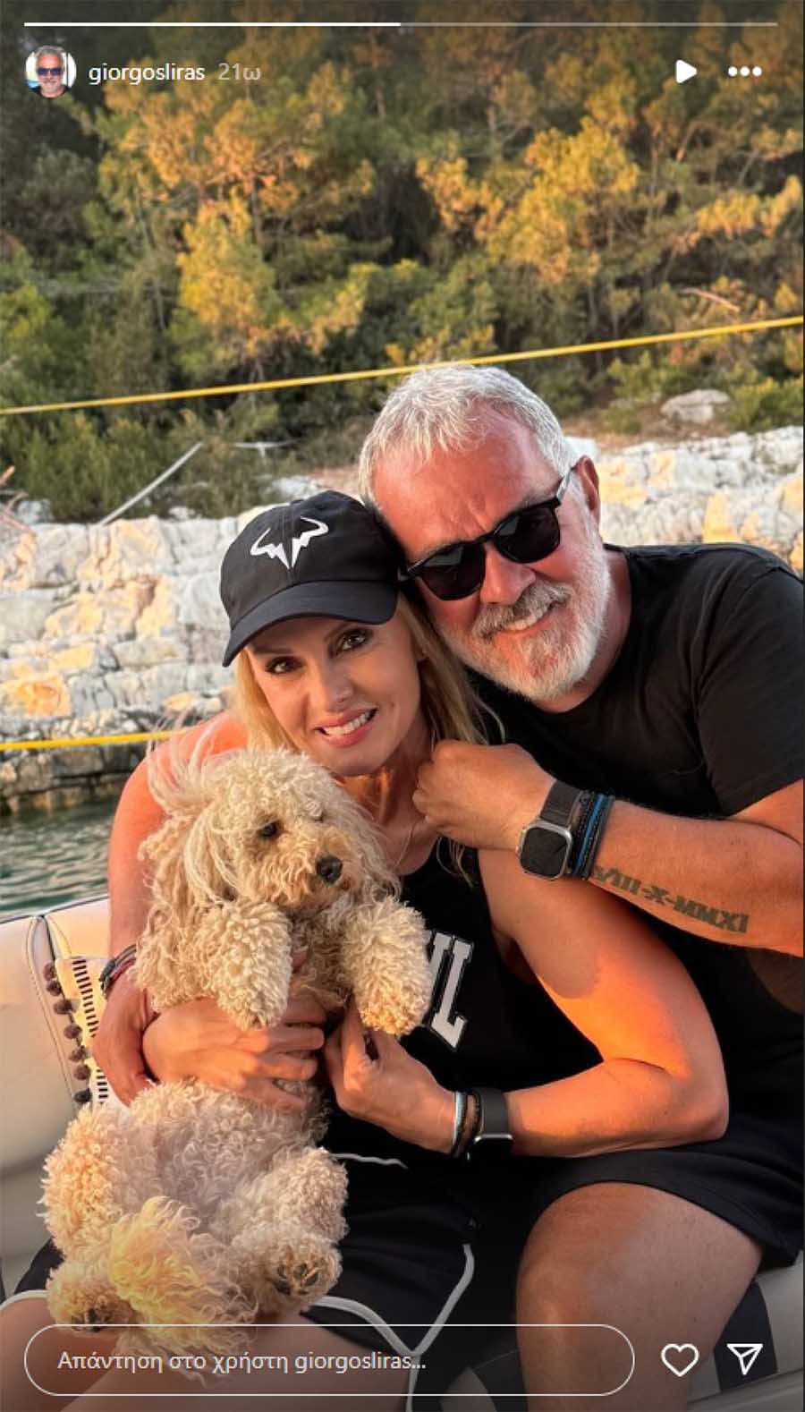 Σε διακοπές βρίσκονται η Πέγκυ Ζήνα και ο Γιώργος Λύρας με την κορούλα τους Ηλέκτρα και τον σκύλο τους. Ο σύζυγος και μάνατζερ της δημοφιλούς ερμηνεύτριας πόσταρε στους λογαριασμούς του στα μέσα κοινωνικής δικτύωσης μια πολύ τρυφερή εικόνα που τραβήχτηκε επάνω στο σκάφος με το οποίο οργώνουν τα πελάγη, δίχως όμως να αποκαλύπτουν την τοποθεσία όπου βρίσκονται κάθε φορά. Στο «κλικ» που δημοσιοποίησε ο Γιώργος Λύρας τον βλέπουμε να αγκαλιάζει την Πέγκυ Ζήνα, η οποία κρατά στην αγκαλιά της τον σκύλο τους, ενώ στο φόντο υπάρχει ένα όμορφο πράσινο τοπίο.