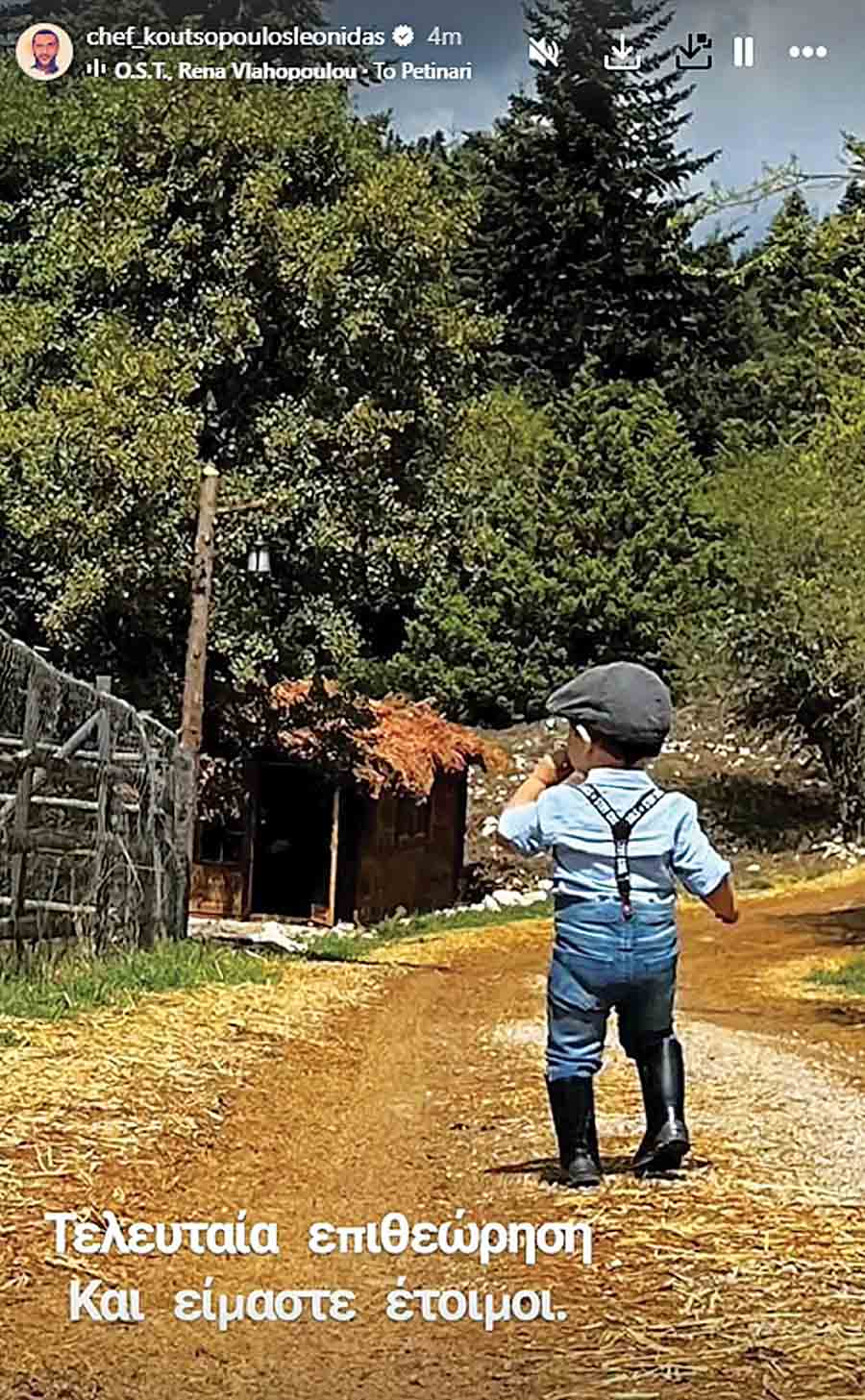 Ο μικρός Κίμωνας ντύθηκε με τραγιάσκα, τιράντες και γαλότσες ως λιλιπούτειος αγρότης, για να συνοδεύσει τον πατέρα του και οικοδεσπότη του ριάλιτι στα γυρίσματα της εκπομπής. Ο Λεωνίδας Κουτσόπουλος τον απαθανάτισε και μοιράστηκε ένα στιγμιότυπο σε story στο Instagram, καλύπτοντας με ένα emoji καρδιάς το πρόσωπο του γιου του. Με χιουμοριστική διάθεση έγραψε: «Τελευταίες διορθώσεις». Λίγο αργότερα επέστρεψε με ακόμα ένα στιγμιότυπο, αυτή τη φορά με το παιδί του πλάτη. «Τελευταία επιθεώρηση και είμαστε έτοιμοι» σχολίασε στο ίδιο ύφος.