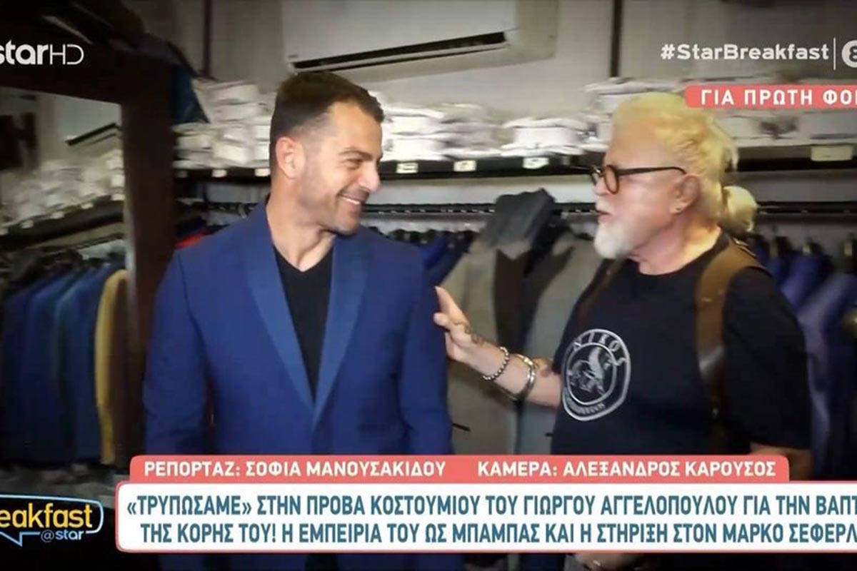 Οι τηλεοπτικές κάμερες συνάντησαν τον Γιώργο Αγγελόπουλο στην πρόβα που έκανε για το κουστούμι που θα φορέσει στη βάφτιση της κόρης του. Στις δηλώσεις που παραχώρησε αναφέρθηκε στην απώλεια της μητέρας του, αλλά και στην κόρη του.