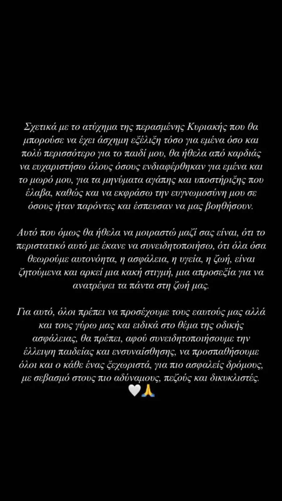 «Σχετικά με το ατύχημα της περασμένης Κυριακής, που θα μπορούσε να έχει άσχημη εξέλιξη τόσο για εμένα όσο και πολύ περισσότερο για το παιδί μου, θα ήθελα από καρδιάς να ευχαριστήσω όλους όσους ενδιαφέρθηκαν για εμένα και για το μωρό μου, για τα μηνύματα αγάπης και υποστήριξης που έλαβα, καθώς και να εκφράσω την ευγνωμοσύνη μου σε όσους ήταν παρόντες και να μας βοηθήσουν. Αυτό που όμως θα ήθελα να μοιραστώ μαζί σας είναι ότι το περιστατικό αυτό με έκανε να συνειδητοποιήσω ότι όλα όσο θεωρούμε αυτονόητα, η ασφάλεια, υγεία, η ζωή είναι ζητούμενα και αρκεί μία κακή στιγμή, μία απροσεξία για να ανατρέψει τα πάντα στη ζωή μας. Γι’ αυτό όλοι πρέπει να προσέχουμε τους εαυτούς μας αλλά και τους γύρω μας και ειδικά στο θέμα της οδικής ασφάλειας θα πρέπει, αφού συνειδητοποιήσουμε την έλλειψη παιδείας και να ενσυναίσθησης, να προσπαθήσουμε όλοι και ο καθένας ξεχωριστά, για πιο ασφαλείς δρόμους με σεβασμό στους πιο αδύναμους, πεζούς και δικυκλιστές» ανέφερε η Αλεξάνδρα Νίκα στην ανάρτησή της.