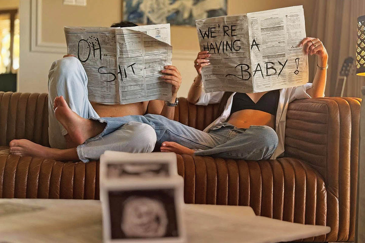 Στα «κλικ» του post οι δυο νέοι εμφανίζονται καθισμένοι στο σαλόνι του σπιτιού τους να διαβάζουν τα ευχάριστα στις… εφημερίδες, ενώ φαίνεται το υπερηχογράφημα του μωρού αλλά και ο σκύλος τους. Με το καλό!