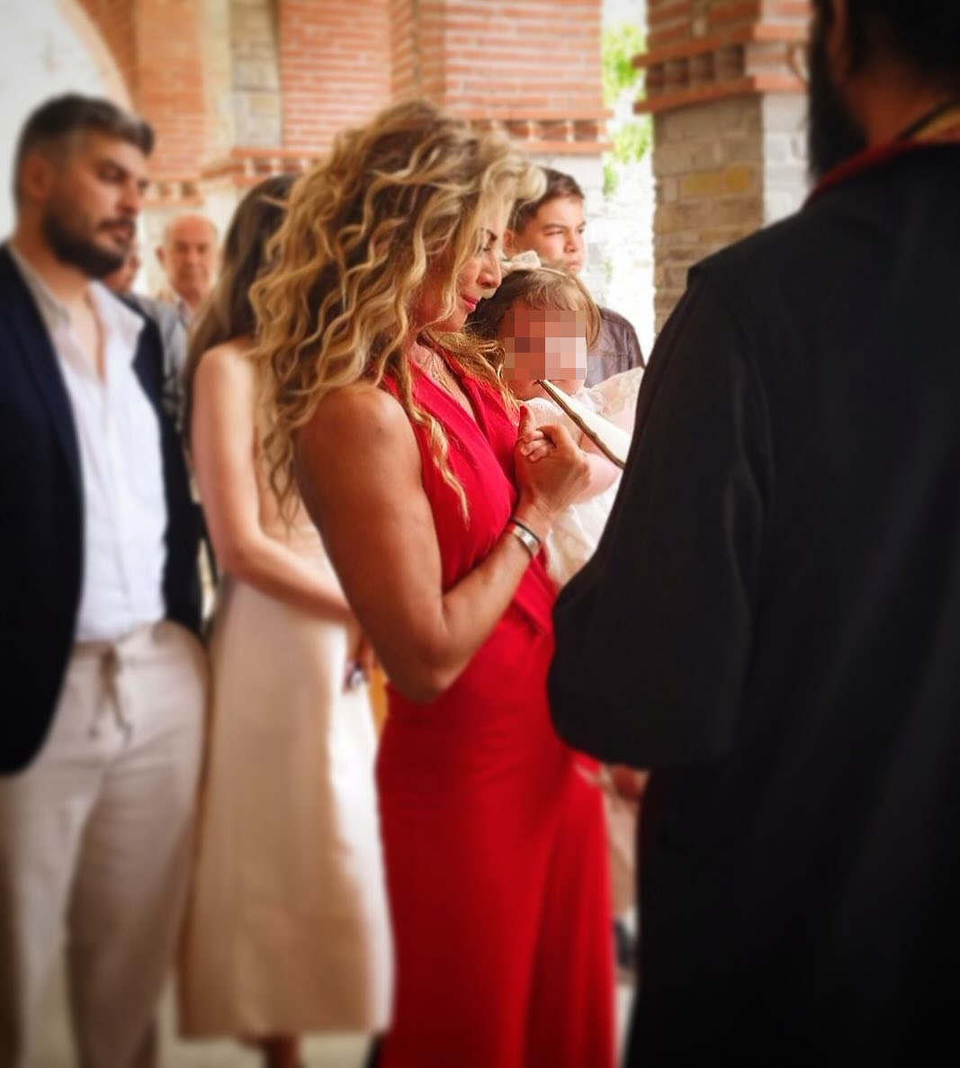 Φορώντας ένα κατακόκκινο φόρεμα που τόνιζε το καλλίγραμμο σώμα της και με τα μαλλιά της κυματιστά βάπτισε τη μικρούλα και δημοσίευσε φωτογραφία τους στο instagram.