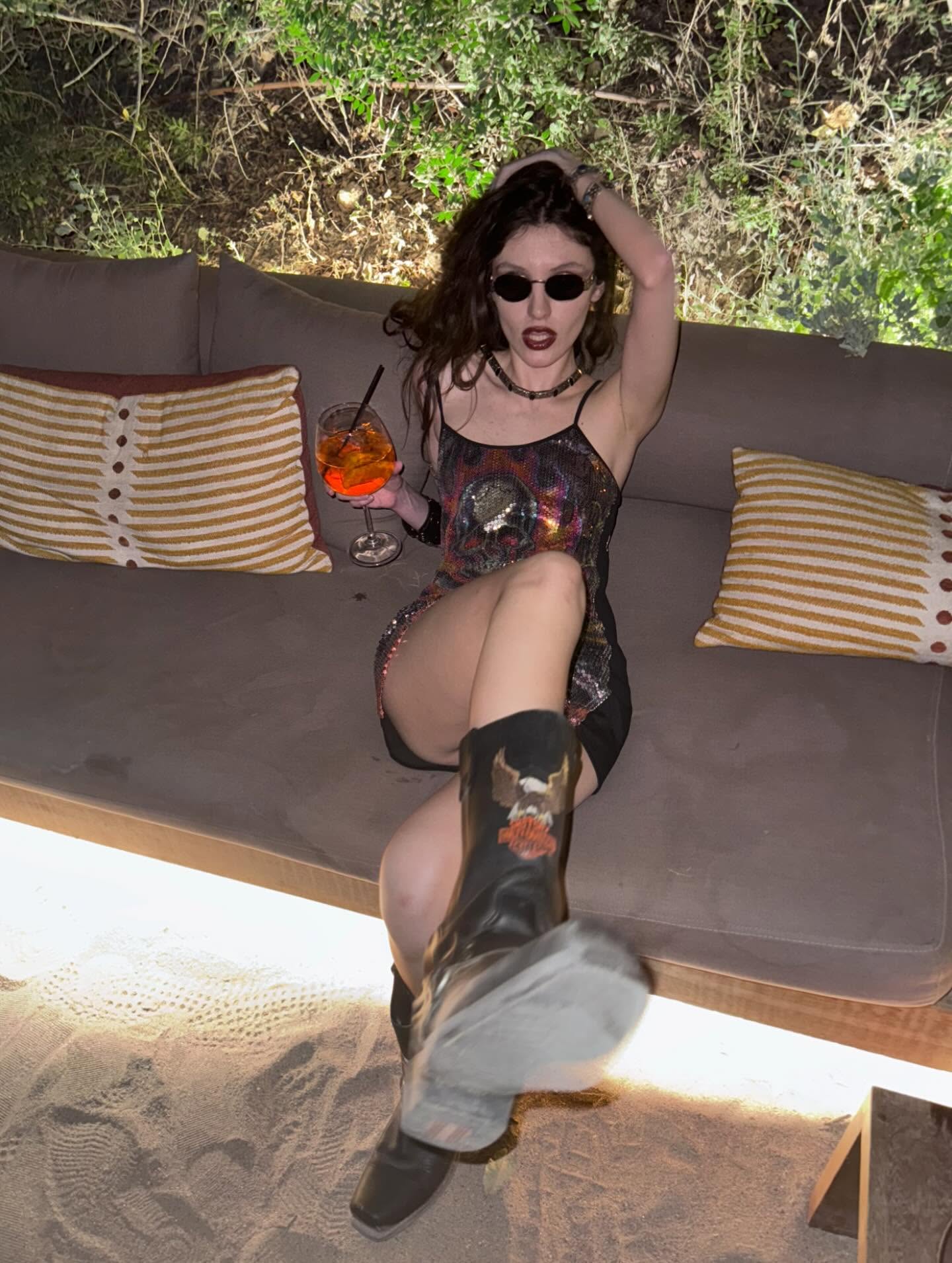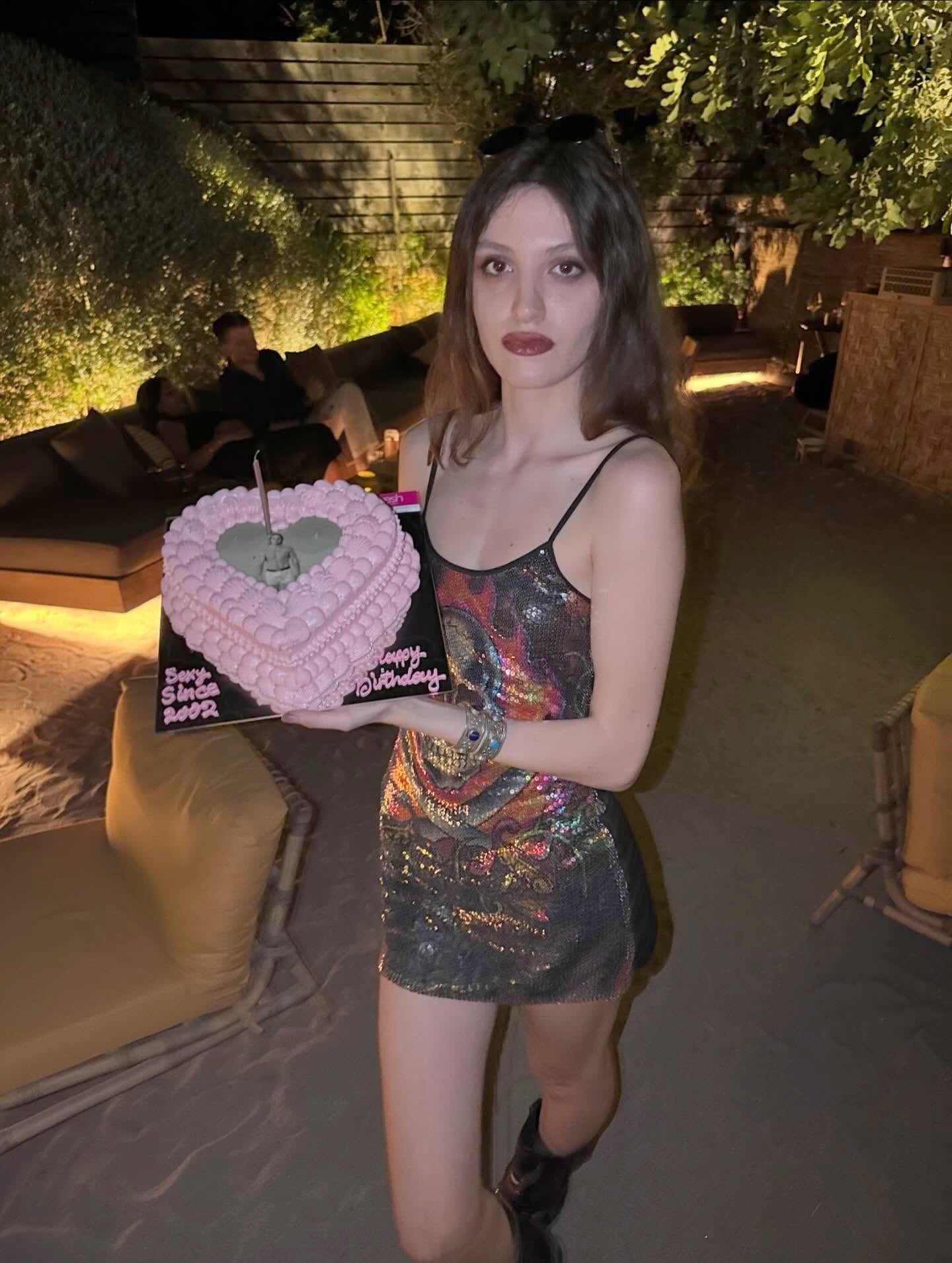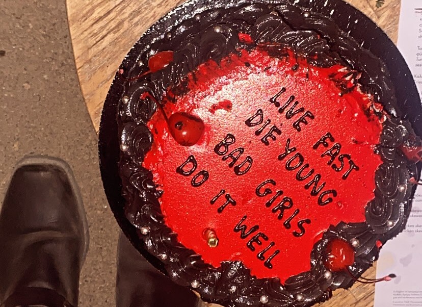 Ντυμένη ροκ με ένα μίνι φόρεμα, συνδυασμένο με μπότες πόζαρε στον φωτογραφικό φακό. Έσβησε κεράκια σε δύο τούρτες με τη μια να γράφει πάνω: «Ζήσε γρήγορα, πέθανε νέα. Τα κακά κορίτσια το κάνουν καλά».