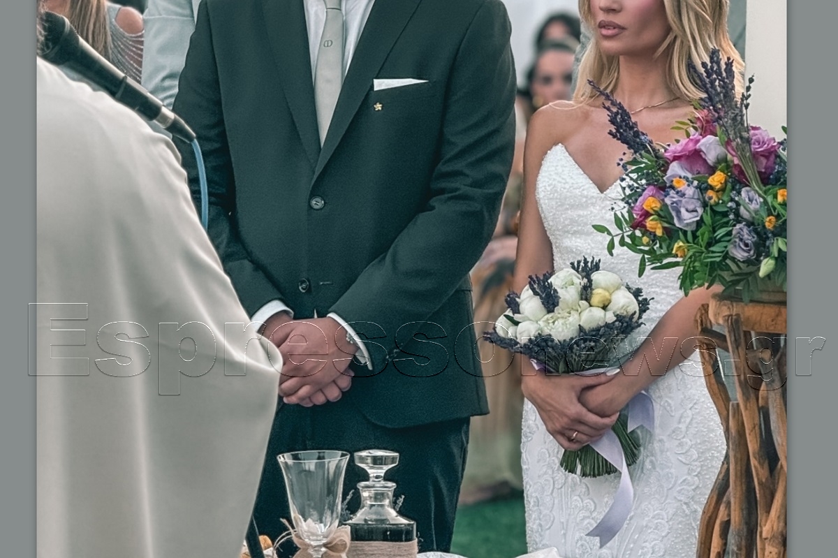 Η νύφη επέλεξε ένα γοργονέ, λευκό νυφικό που τόνιζε το καλλίγραμμο σώμα της και στη δεξίωση που ακολούθησε κράτησε το μπούστο και από κάτω έβαλε ένα εντυπωσιακό παντελόνι.