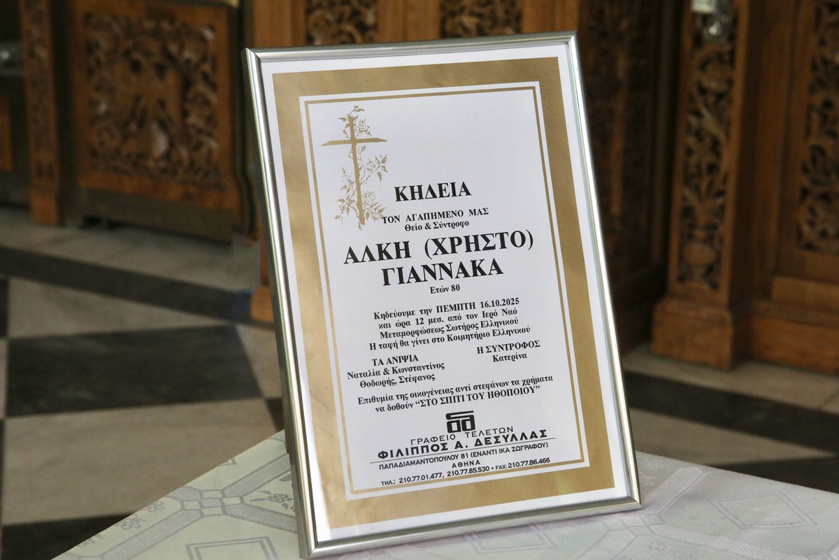 Το τελευταίο αντίο στον Άλκη Γιαννακά είπαν συγγενείς, φίλοι και συνάδελφοί του στον Ιερό Ναό Μεταμορφώσεως του Σωτήρος στο Ελληνικό το πρωί της Πέμπτης.
