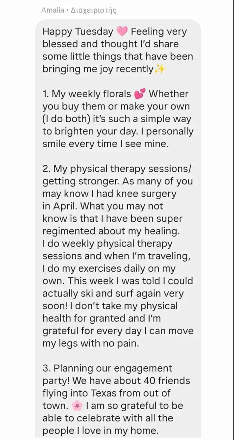 Συγκεκριμένα η Αμαλία Κωστοπούλου ανέφερε: «Νιώθω πολύ ευλογημένη και σκέφτηκα ότι θα ήθελα να μοιραστώ μερικά μικρά πράγματα που μου φέρνουν χαρά τις τελευταίες ημέρες. Διοργανώνω το πάρτι αρραβώνων μου! Έχουμε περίπου 40 φίλους που θα πετάξουν στο Τέξας από άλλα μέρη. Είμαι τόσο ευγνώμων που θα μπορέσω να το γιορτάσω με όλους τους ανθρώπους που αγαπώ στο σπίτι μου».