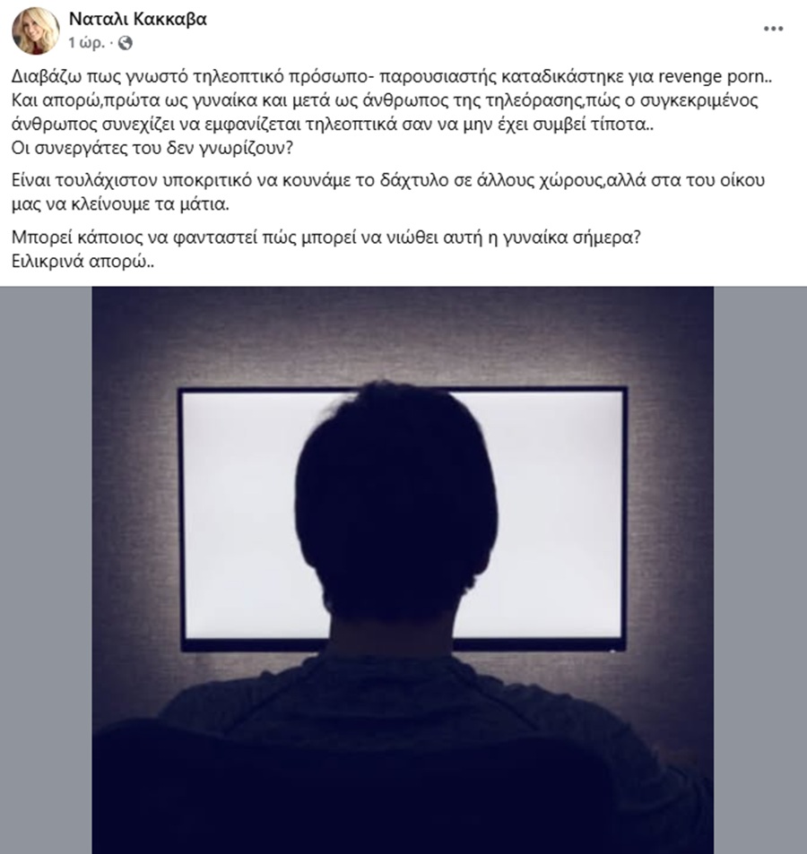 «Διαβάζω πως γνωστό τηλεοπτικό πρόσωπο- παρουσιαστής καταδικάστηκε για revenge porn. Και απορώ, πρώτα ως γυναίκα και μετά ως άνθρωπος της τηλεόρασης, πώς ο συγκεκριμένος άνθρωπος συνεχίζει να εμφανίζεται τηλεοπτικά σαν να μην έχει συμβεί τίποτα.