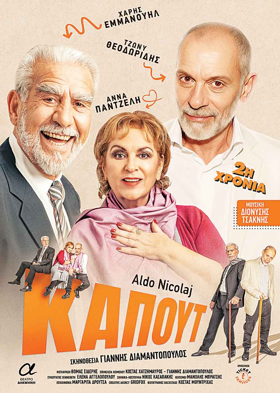 Το έργο «Καπούτ», που θα παρουσιάζεται στη σκηνή του θεάτρου Αλκμήνη κάθε Δευτέρα και Τρίτη στις 18.30, εστιάζει με λεπτότητα και χιούμορ στα προβλήματα της τρίτης ηλικίας, που, αν και αποτελούν μια πραγματικότητα της εποχής μας, έχουν απασχολήσει λίγο τη σύγχρονη δραματουργία. Με διεισδυτική ματιά «φωτίζει» κόσμο των ηλικιωμένων, έναν κόσμο φαινομενικά απλό και ανέμελο, που όμως είναι γεμάτος μελαγχολία, βίαια πάθη, αδύνατες προσδοκίες, βαθιές απογοητεύσεις, φόβους και ανασφάλειες. Μια υπέροχη παραβολή για τα γηρατειά, μια κωμωδία που εγείρει μια ολόκληρη σειρά προβληματισμών για τη συχνά σκληρή μοίρα των ηλικιωμένων στην κοινωνία μας.