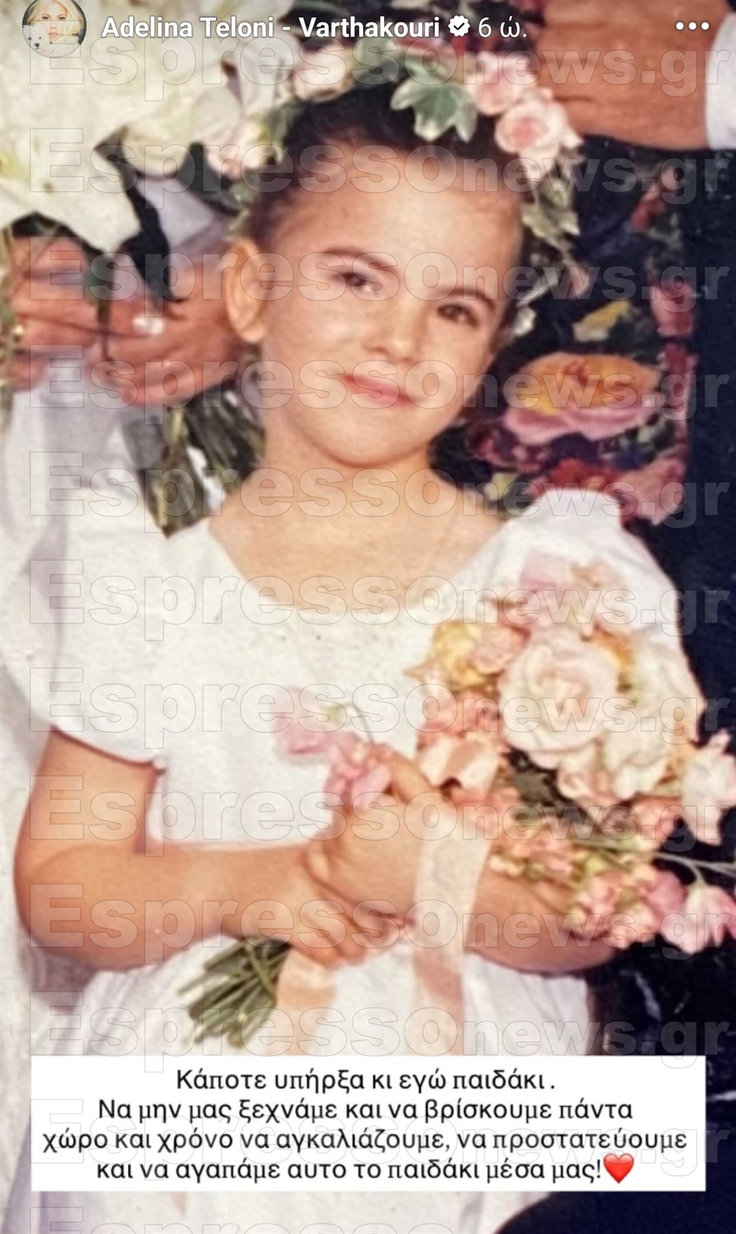 Η παρουσιάστρια έγραψε στη λεζάντα της φωτογραφίας: «Κάποτε υπήρξα κι εγώ παιδάκι. Να μη μας ξεχνάμε και να βρίσκουμε πάντα χώρο και χρόνο να αγκαλιάζουμε, να προστατεύουμε και να αγαπάμε αυτό το παιδάκι μέσα μας».