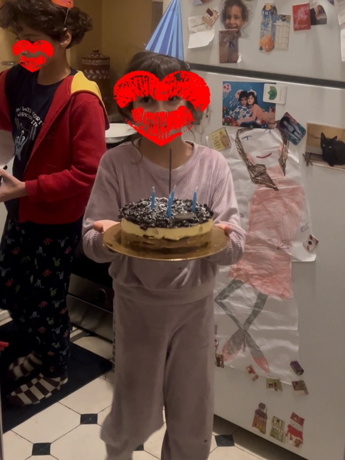 Ο Σταύρος Ξαρχάκος κρατώντας την τούρτα και τα παιδιά φορώντας καπελάκια για πάρτι της τραγούδησαν το γενέθλιο κομμάτι.