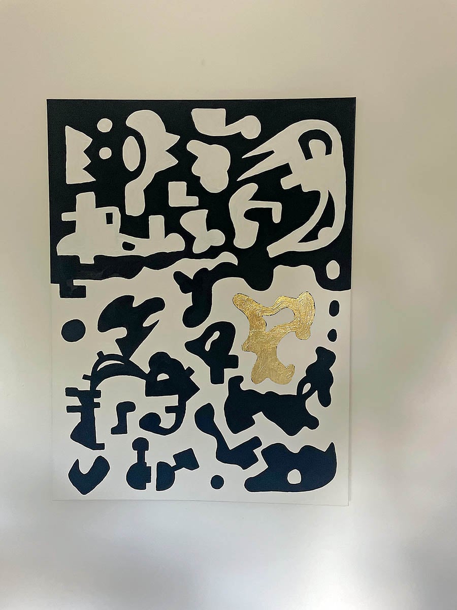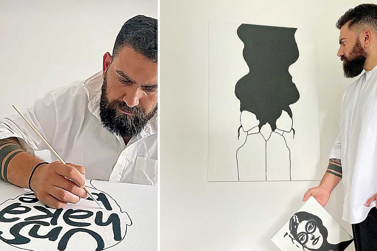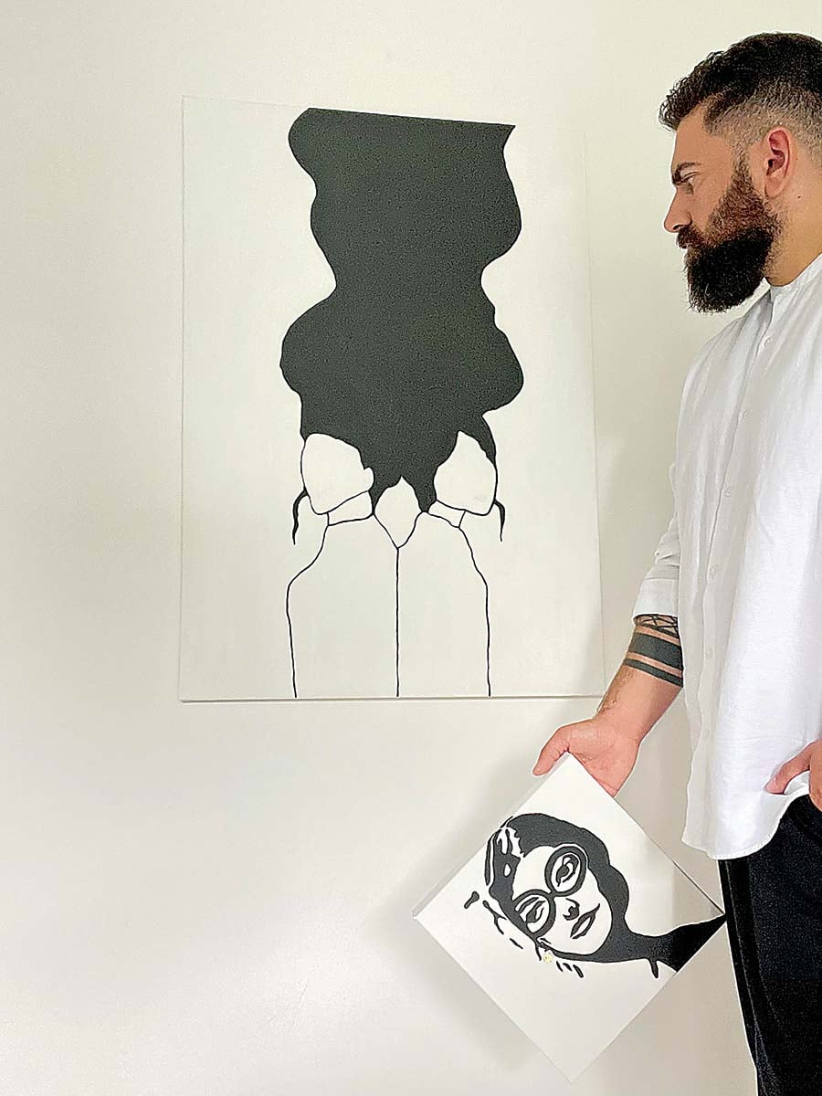 Ναι, χρησιμοποιώ μαύρο, λευκό και χρυσό – είναι καθοριστικά χρώματα για τη δουλειά μου. Η τέχνη μου συνδυάζει μινιμαλισμό και συμβολισμό. Με αυτούς τους τρεις χρωματισμούς προσπαθώ να δώσω έναν μοντέρνο τόνο σε κάθε έργο, ενώ κρύβω ένα νόημα που ο θεατής μπορεί να ανακαλύψει μέσα από τις λεπτομέρειες. Κάθε έργο μου, είτε είναι εμπνευσμένο από ένα προσωπικό είτε από κοινωνικό γεγονός, θέλω να αποτυπωθεί διακριτικά στον καμβά.