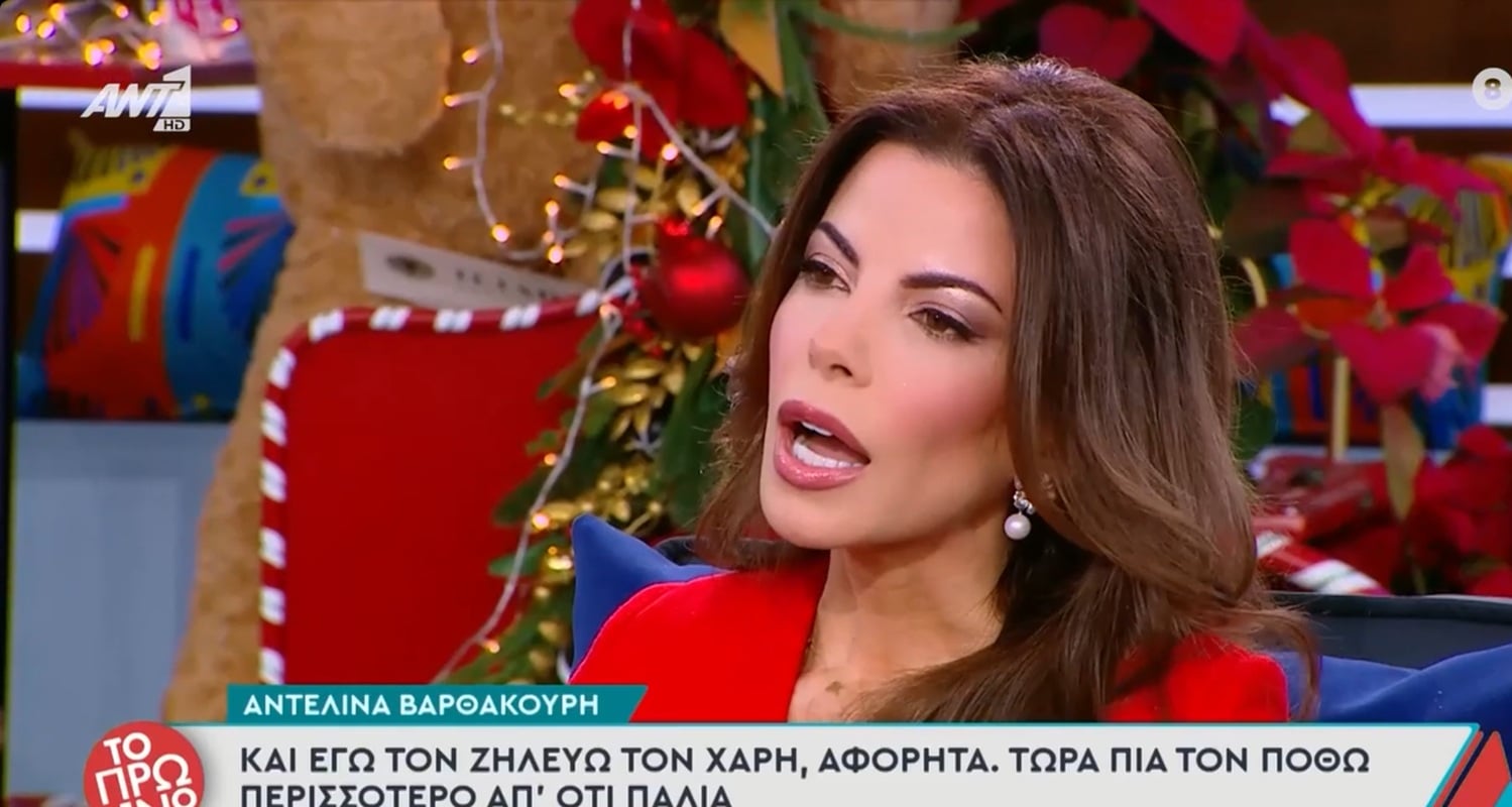 «Ο Χάρης είναι ο άνθρωπος που, όταν είμαστε στο σπίτι, θέλει να είμαι άβαφτη, να είμαι η Αντελίνα του, να πιάνει τα ρούχα με το ύφασμα το βαμβακερό της πιτζάμας. Να είμαι το κορίτσι του που θα φάμε, που θα μαγειρέψω, που θα τον περιποιηθώ. Αμέσως μετά, δε, ο Χάρης Βαρθακούρης σημείωσε χαρακτηριστικά πως “τρεις μου την έπεσαν για εκείνη τη δήλωση. Γιώργο μου, θα σου πω γιατί το έχω φιλοσοφήσει. Αδιαφορώ. Το πρόβλημα μου δεν είναι τι λένε, είναι ποιοι το λένε.