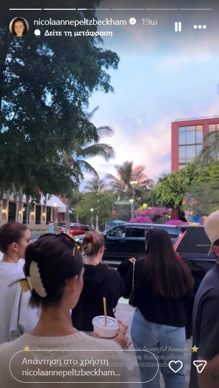 Σε story που ανάρτησε στο Instagram, η 30χρονη Νίκολα επέλεξε να εστιάσει στους ανθρώπους που έχει δίπλα της, γράφοντας πως νιώθει ευγνωμοσύνη που ξεκινά τη νέα χρονιά με «αυτούς τους υπέροχους ανθρώπους». Στη φωτογραφία εμφανίζονταν φίλοι και συγγενείς, ενώ το ζευγάρι φάνηκε για ακόμη μία φορά να κρατά αποστάσεις από την οικογένεια Μπέκαμ.
