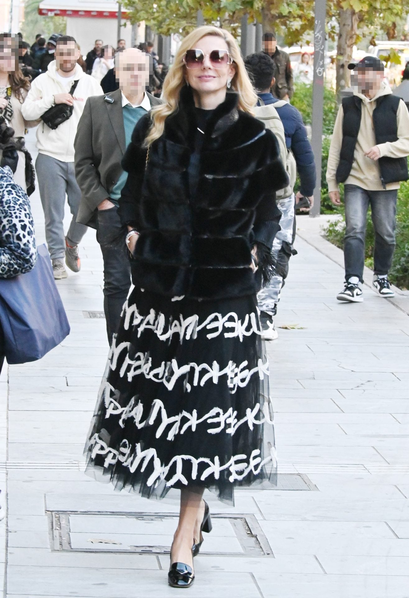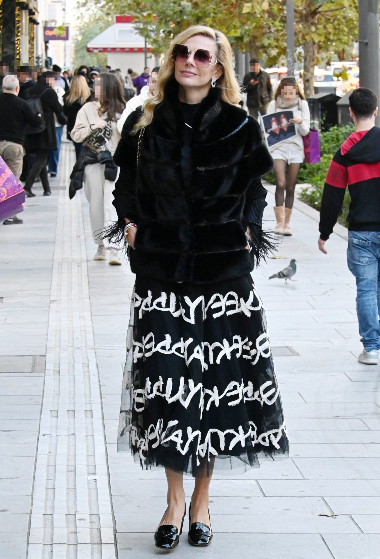 Η γνωστή δημοσιογράφος και παρουσιάστρια επέλεξε ένα total black look με γούνα σε κοντή γραμμή και μακριά τούλινη φούστα διακοσμημένη με λευκά γράμματα σε μοντέρνο σχέδιο.