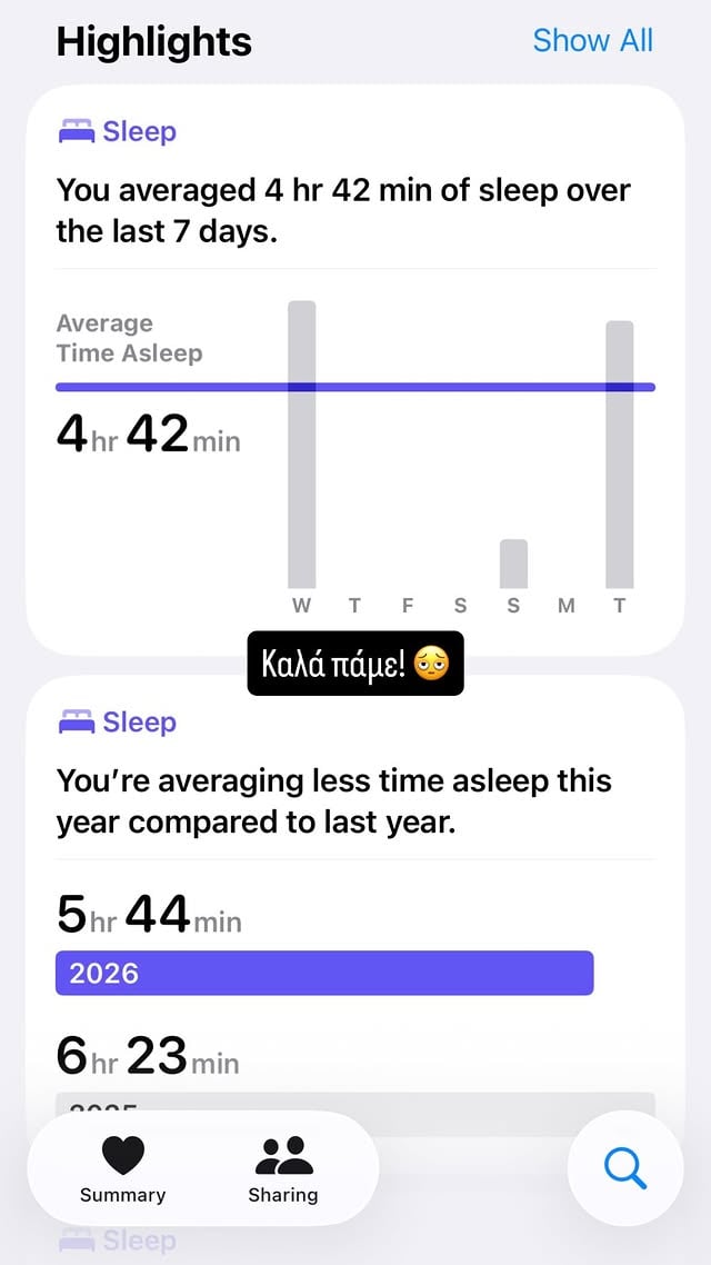 Η ηθοποιός πόσταρε τις ώρες που κοιμάται όπως της κατέγραψε το ρολόι της και έγραψε: «Καλά πάμε». «Υπάρχουν πάρα πολλά συναισθήματα πρωτόγνωρα που δεν τα φανταζόμουν.