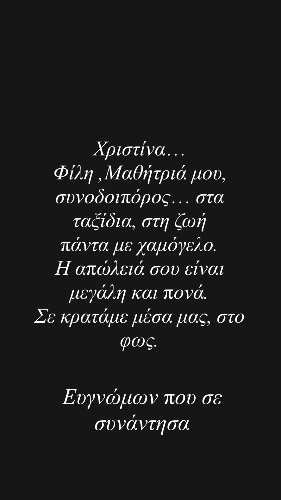 «Χριστίνα φίλη, μαθήτριά μου, συνοδοιπόρος στα ταξίδια, στη ζωή πάντα με χαμόγελο. Η απώλειά σου είναι μεγάλη και πονά. Σε κρατάμε μέσα μας στο φως, ευγνώμων που σε συνάντησα».