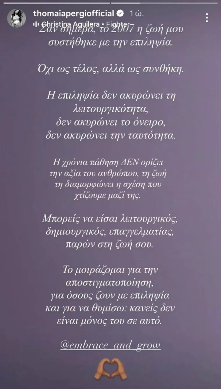 «Το μοιράζομαι για την αποστιγματοποίηση και για όσους ζουν με επιληψία. Για να θυμίσω ότι κανείς δεν είναι μόνος του», αναφέρει μεταξύ άλλων, στέλνοντας ένα δυνατό μήνυμα στήριξης και αλληλεγγύης.