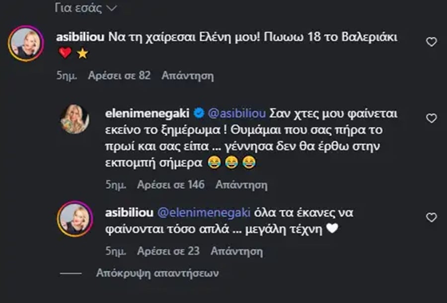 Η γνωστή αστρολόγος της ευχήθηκε κάτω από το ποστ και ξεκίνησαν να μιλάνε. «Να τη χαίρεσαι Ελένη μου! Πωωω 18 το Βαλεριάκι» έγραψε με την παρουσιάστρια να της απαντάει: «Σαν χθες μου φαίνεται εκείνο το ξημέρωμα! Θυμάμαι που σας πήρα το πρωί και σας είπα, γέννησα, δε θα έρθω στην εκπομπή σήμερα».