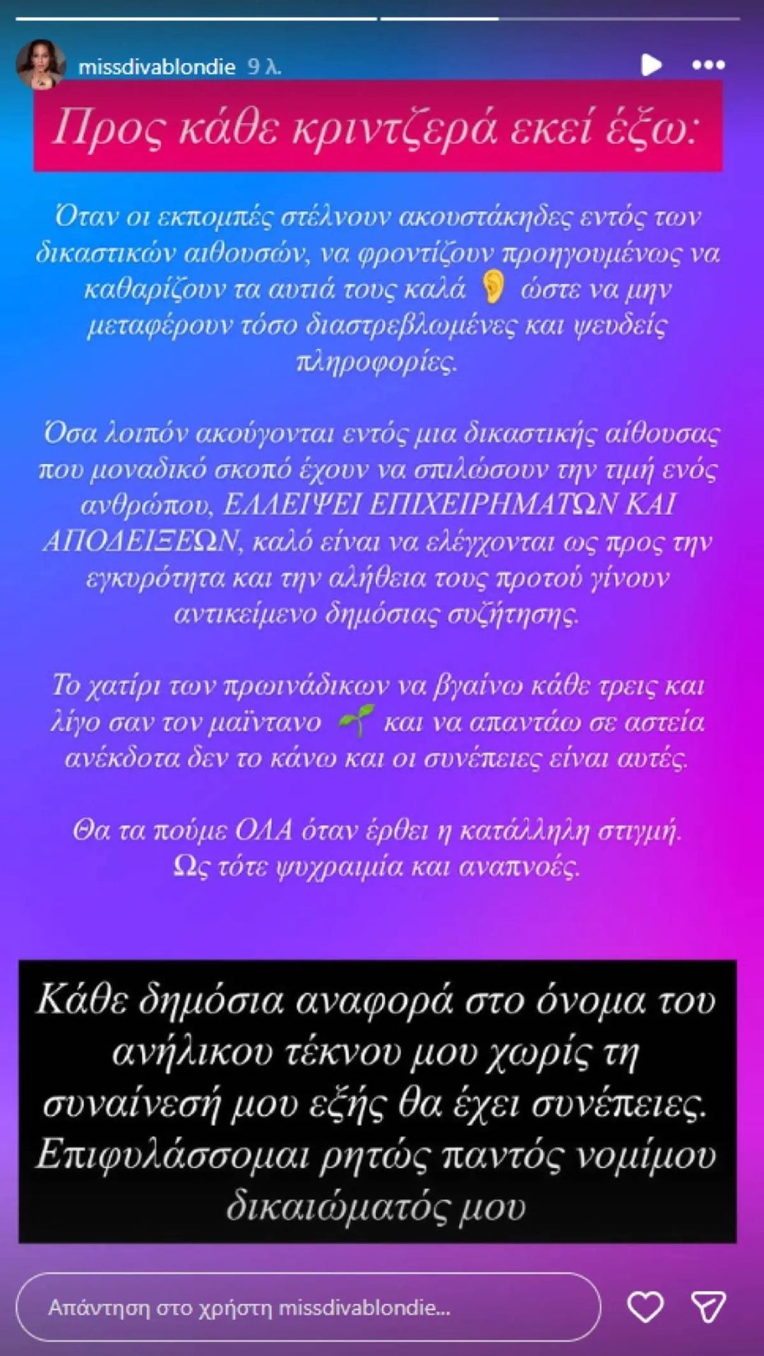 «Θα τα πούμε ΟΛΑ όταν έρθει η κατάλληλη στιγμή. Ως τότε ψυχραιμία και αναπνοές. Κάθε δημόσια αναφορά στο όνομα του ανήλικου τέκνου μου χωρίς τη συναίνεσή μου εξής θα έχει συνέπειες. Επιφυλάσσομαι ρητώς παντός νομίμου δικαιώματός μου».
