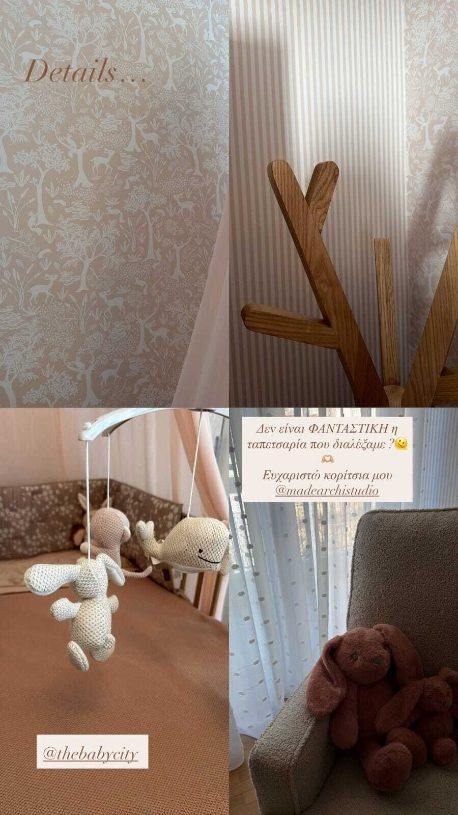 Για το δωμάτιο διάλεξε ξύλινα έπιπλα, τόσο για την κούνια όσο και για την αλλαξιέρα, ενώ στους τοίχους μπήκε ταπετσαρία, με ελαφάκια στη μία πλευρά και ρίγες στην άλλη, σε μπεζ και καφέ. Για να ολοκληρωθεί η διαμόρφωση, συνεργάστηκε και με διακοσμήτριες, αφού η ίδια είναι σε προχωρημένη εγκυμοσύνη, ενώ έχει και καθημερινές επαγγελματικές υποχρεώσεις.