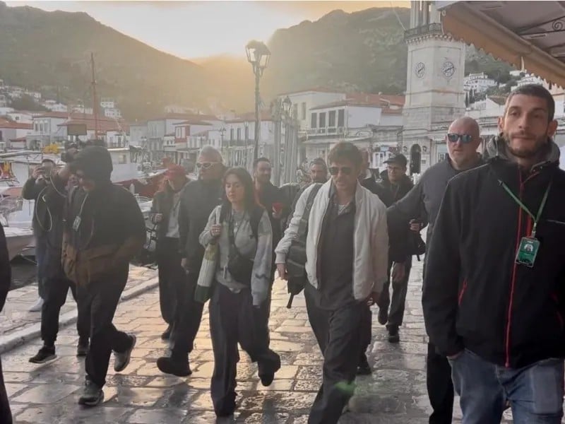 Οι κάμερες άναψαν ήδη στην παραλία της Υδρας, με τον σταρ να διασχίζει το λιμάνι συνοδευόμενος από το συνεργείο, που άνοιγε διάδρομο μέσα από τον κόσμο. Επόμενος σταθμός η Σχολή Καλών Τεχνών, όπου έχει στηθεί μέρος του σκηνικού, αξιοποιώντας τη μοναδική αρχιτεκτονική και το φως του νησιού.