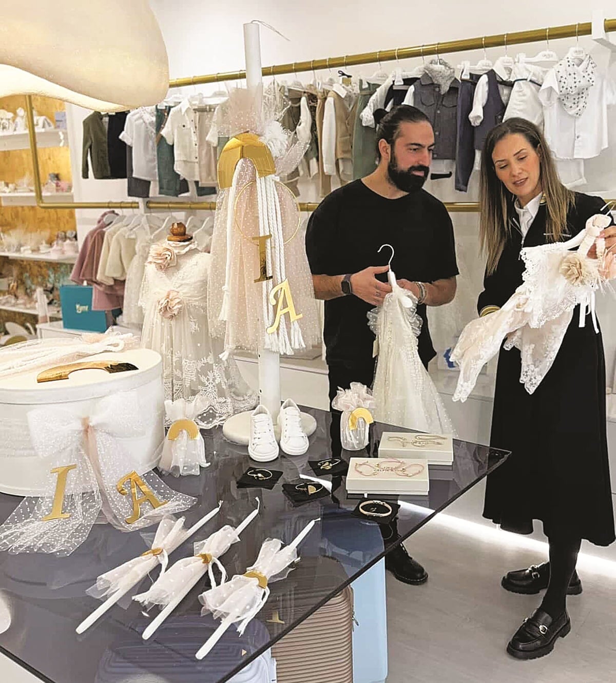 Το μυστήριο τελέστηκε στον Ιερό Ναό Αγίου Νεκταρίου, στο Νέο Ηράκλειο, και ήταν σε στενό κύκλο, όπως και το κέρασμα που ακολούθησε στον προαύλιο χώρο της εκκλησίας. Ο Μιχάλης και η Κωνσταντίνα επιμελήθηκαν προσωπικά κάθε λεπτομέρεια του μυστηρίου, δίνοντας τη δική τους αισθητική και βάζοντας αγάπη σε όλα. Τα βαφτιστικά είδη επιλέχθηκαν από το ατελιέ Fedra Tales της Μαρίας Θεοδωρίδου, στο Κερατσίνι, με τον περήφανο μπαμπά να φωτογραφίζεται κιόλας την ώρα που αναζητούσε το ιδανικό outfit για τη μικρή Ισιδα Αστερόπη.