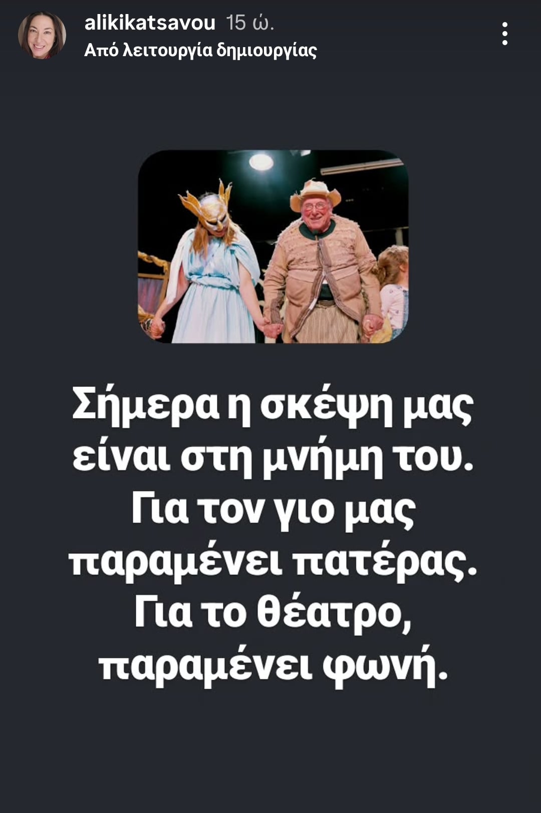Με τη σύζυγό του, Αλίκη Κατσαβού να ποστάρει κοινή τους φωτογραφία και να γράφει: «Σήμερα η σκέψη μας είναι στη μνήμη του. Για τον γιο μας παραμένει πατέρας, για το θέατρο παραμένει φωνή».