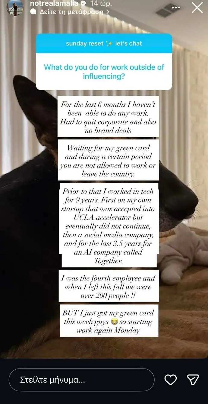 «Τους τελευταίους 6 μήνες δεν μπορούσα να δουλέψω καθόλου. Αναγκάστηκα να φύγω από την εταιρική δουλειά μου και επίσης δεν μπορούσα να κάνω brand deals. Περίμενα την πράσινη κάρτα μου και για ένα συγκεκριμένο χρονικό διάστημα δεν επιτρέπεται να δουλεύεις ούτε να φύγεις από τη χώρα.
