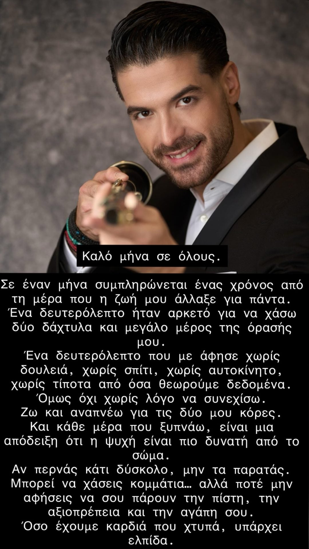Στο μήνυμά του γράφει: «Καλό μήνα σε όλους. Σε έναν μήνα συμπληρώνεται ένας χρόνος από τη μέρα που η ζωή μου άλλαξε για πάντα. Ένα δευτερόλεπτο ήταν αρκετό για να χάσω δύο δάχτυλα και μεγάλο μέρος της όρασής μου.