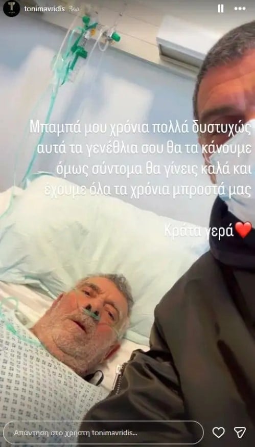«Μπαμπά μου, xρόνια πολλά. Δυστυχώς αυτά τα γενέθλια σου (δε) θα τα κάνουμε όμως σύντομα θα γίνεις καλά και έχουμε όλα τα χρόνια μπροστά μας. Κράτα γερά», έγραψε ο Τόνυ Μαυρίδης στην ανάρτηση, η οποία έγινε κατευθείαν από το δωμάτιο νοσηλείας του πατέρα του.