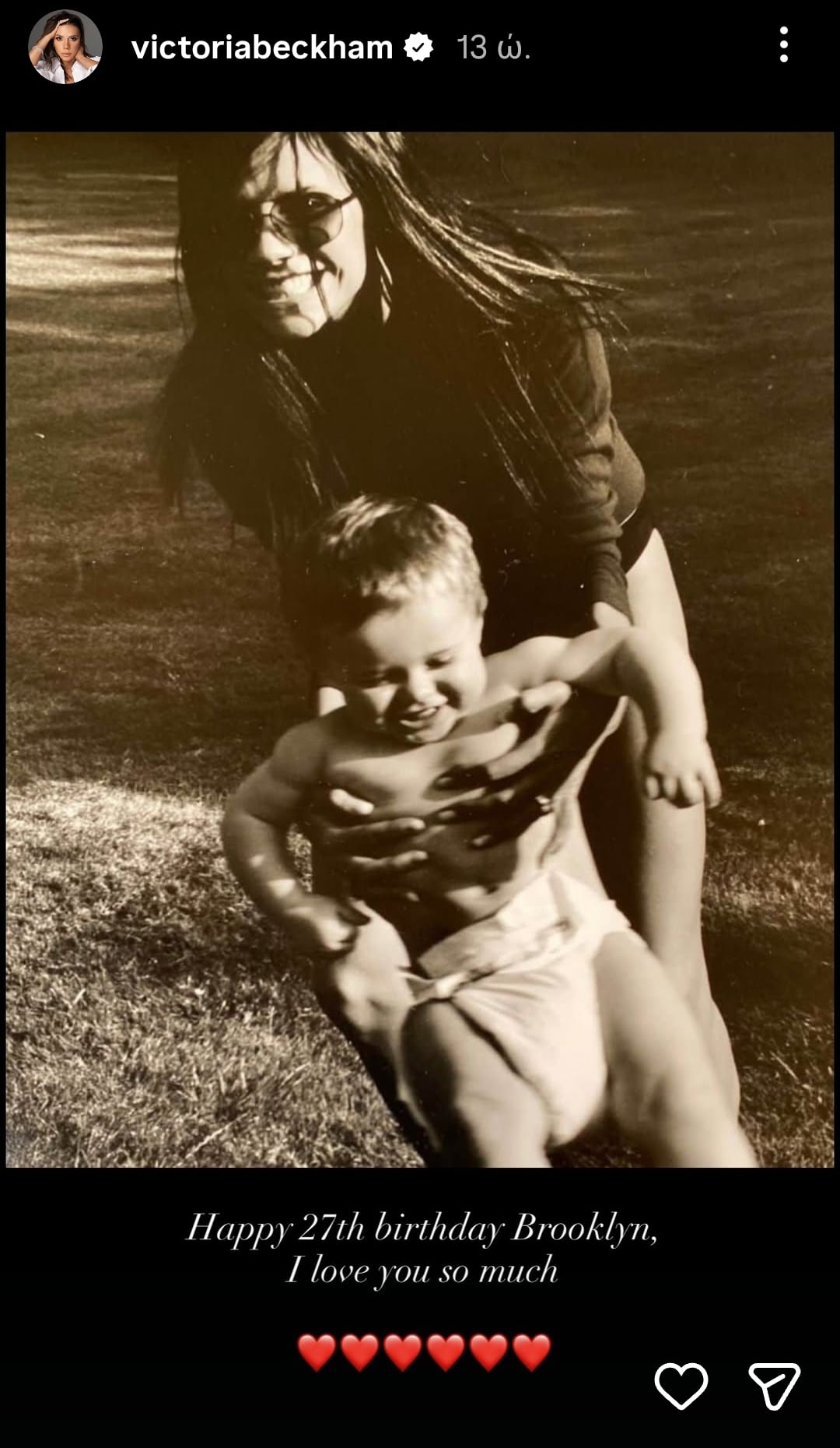 Η Βικτώρια Μπέκαμ δημοσίευσε φωτογραφίες και έγραψε: «Χρόνια πολλά Μπρούκλιν, σε αγαπάμε τόσο πολύ. Χαρούμενα 27 Μπρούκλιν! Σε αγαπάμε!».