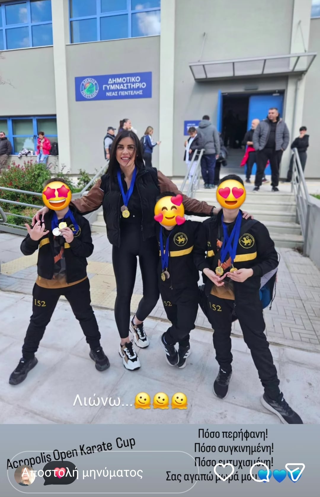 Η δημοσιογράφος δημοσίευσε φωτογραφίες με τον σύζυγό της και τα τρία τους παιδιά. Οι μικροί συμμετείχαν σε αγώνες καράτε και πήραν μετάλλια με την περήφανη μαμά να γράφει: «Πόσο περήφανη, πόσο συγκινημένη, πόσο ευτυχισμένη. Σας αγαπώ μωρό μου».