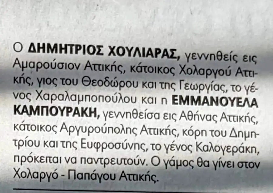 Την ξαναβρίσκεις όμως την ισορροπία, το παιδί θέλει προσοχή γιατί δεν πρέπει να είσαι ούτε υπερπροστατευτικός αλλά ούτε και να εφησυχάζεις. Έχει ανάγκες το παιδί», έχει πει σε συνέντευξή του ο δημοσιογράφος. Η αναγγελία του γάμου δημοσιεύτηκε στα παραπολιτικά και αναφέρει: «Ο Δημήτριος Χουλιάρας, γεννηθείς εις Αμαρούσιον Αττικής, κάτοικος Χολαργού Αττικής, γιος του Θεοδώρου και της Γεωργίας, το γένος Χαραλαμποπούλου, και η Εμμανουέλα Καμπουράκη, γεννηθείσα εις Αθήνας Αττικής, κάτοικος Αργυρούπολης, κόρη του Δημητρίου και της Ευφροσύνης, το γένος Καλογεράκη, πρόκειται να παντρευτούν. Ο γάμος θα γίνει στον Χολαργό – Παπάγου Αττικής».