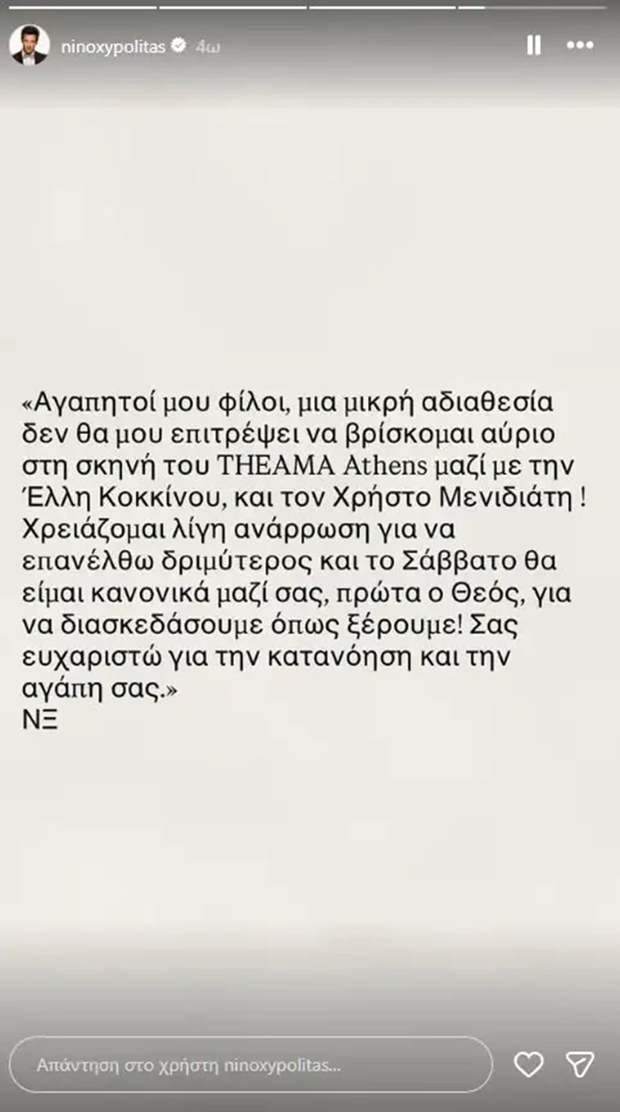 Στην ανάρτησή του έγραψε: «Αγαπητοί φίλοι, μια μικρή αδιαθεσία δε θα μου επιτρέψει να βρίσκομαι αύριο στη σκηνή του THEAMA Athens μαζί με την Έλλη Κοκκίνου και τον Χρήστο Μενιδιάτη! Χρειάζομαι λίγη ανάρρωση για να επανέλθω δριμύτερος και το Σάββατο να είμαι κανονικά μαζί σας, πρώτα ο Θεός, για να διασκεδάσουμε όπως ξέρουμε! Σας ευχαριστώ για την κατανόηση και την αγάπη σας», έγραψε ο Νίνο.