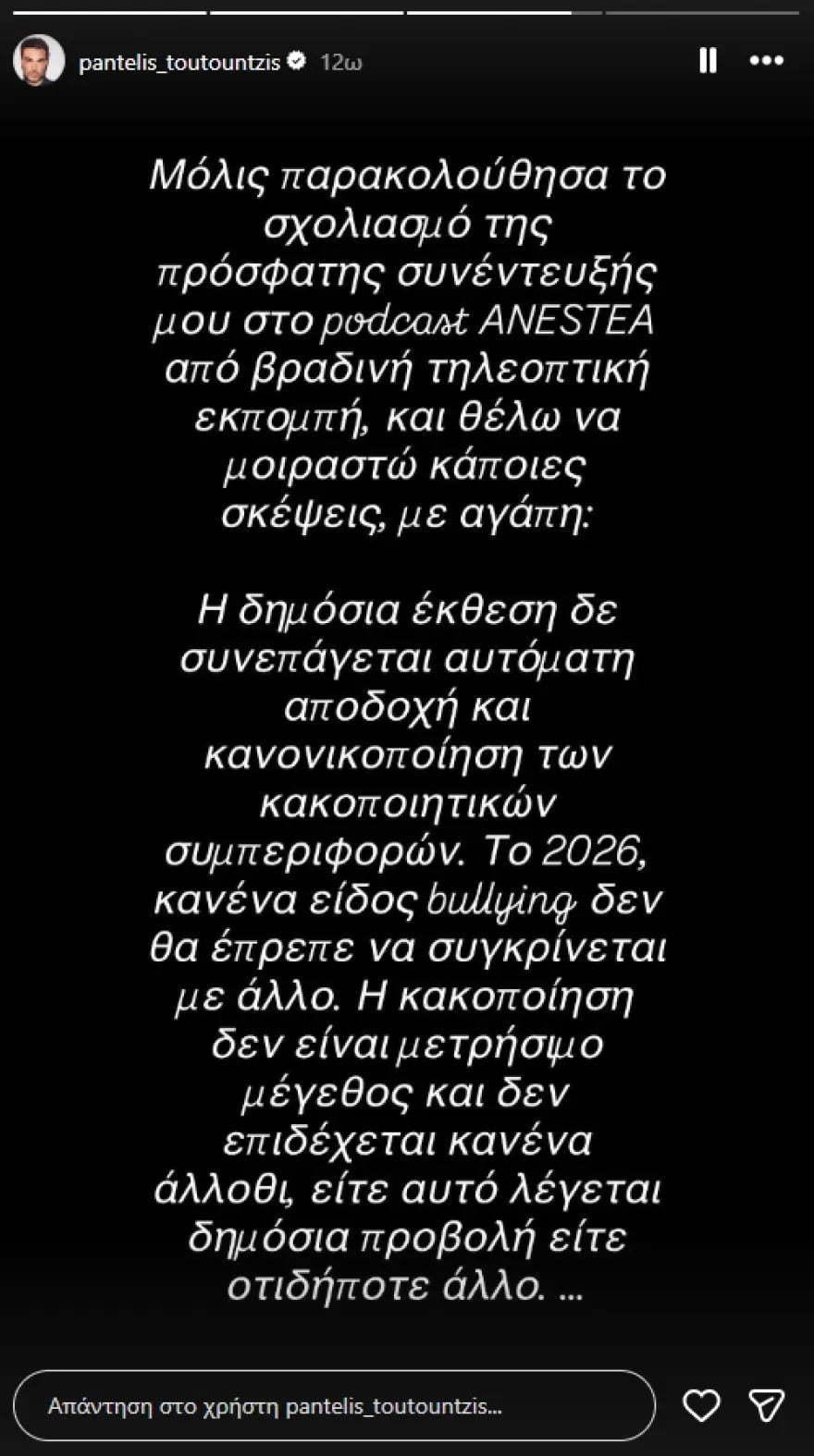 Ο Παντελής Τουτουντζής θέλησε την Πέμπτη 5 Μαρτίου να τοποθετηθεί μέσω Instagram story, ξεκαθαρίζοντας τη θέση του και εκφράζοντας τη δυσαρέσκειά του για τον τρόπο με τον οποίο σχολιάστηκε η συνέντευξη. Όπως έγραψε: