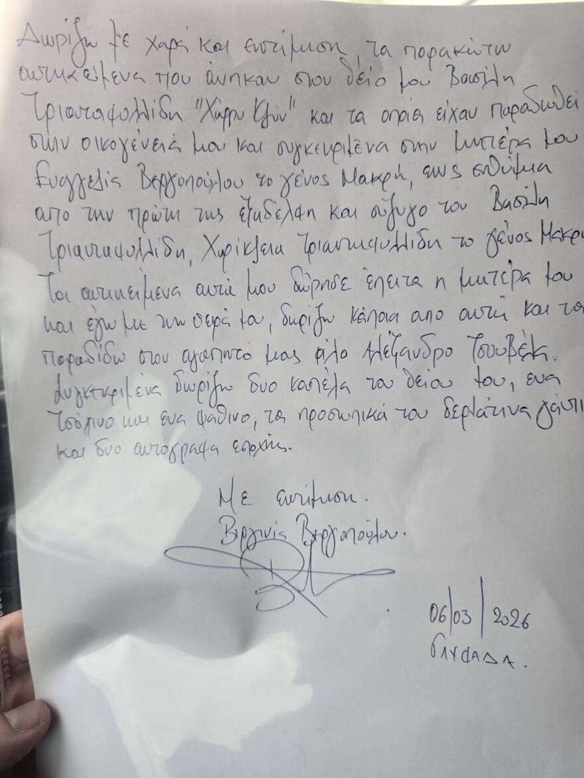 Το χειρόγραφο σημείωμα αναφέρει: «Δωρίζω με χαρά και εκτίμηση τα παρακάτω αντικείμενα που ανήκαν στον θείο μου Βασίλη Τριανταφυλλίδη “Χάρρυ Κλυν” και τα οποία είχαν παραδοθεί στην οικογένειά μου και συγκεκριμένα στη μητέρα μου Ευαγγελία Βεργοπούλου, το γένος Μακρή, ως ενθύμιο από την πρώτη της ξαδέλφη και σύζυγο του Βασίλη Τριανταφυλλίδη, Χαρίκλεια Τριανταφυλλίδη το γένος Μακρή. Τα αντικείμενα αυτά μου δώρισε έπειτα η μητέρα μου και εγώ με τη σειρά μου, δωρίζω κάποια από αυτά και τα παραδίδω στον αγαπητό μας φίλο Αλέξανδρο Τσουβέλα. Συγκεκριμένα περιέχουν δύο καπέλα του θείου του, ένα τσόχινο και ένα ψάθινο, τα προσωπικά του δερμάτινα γάντια και δύο αυτόγραφα εποχής. Με εκτίμηση, Βύρων Βεργοπούλου».