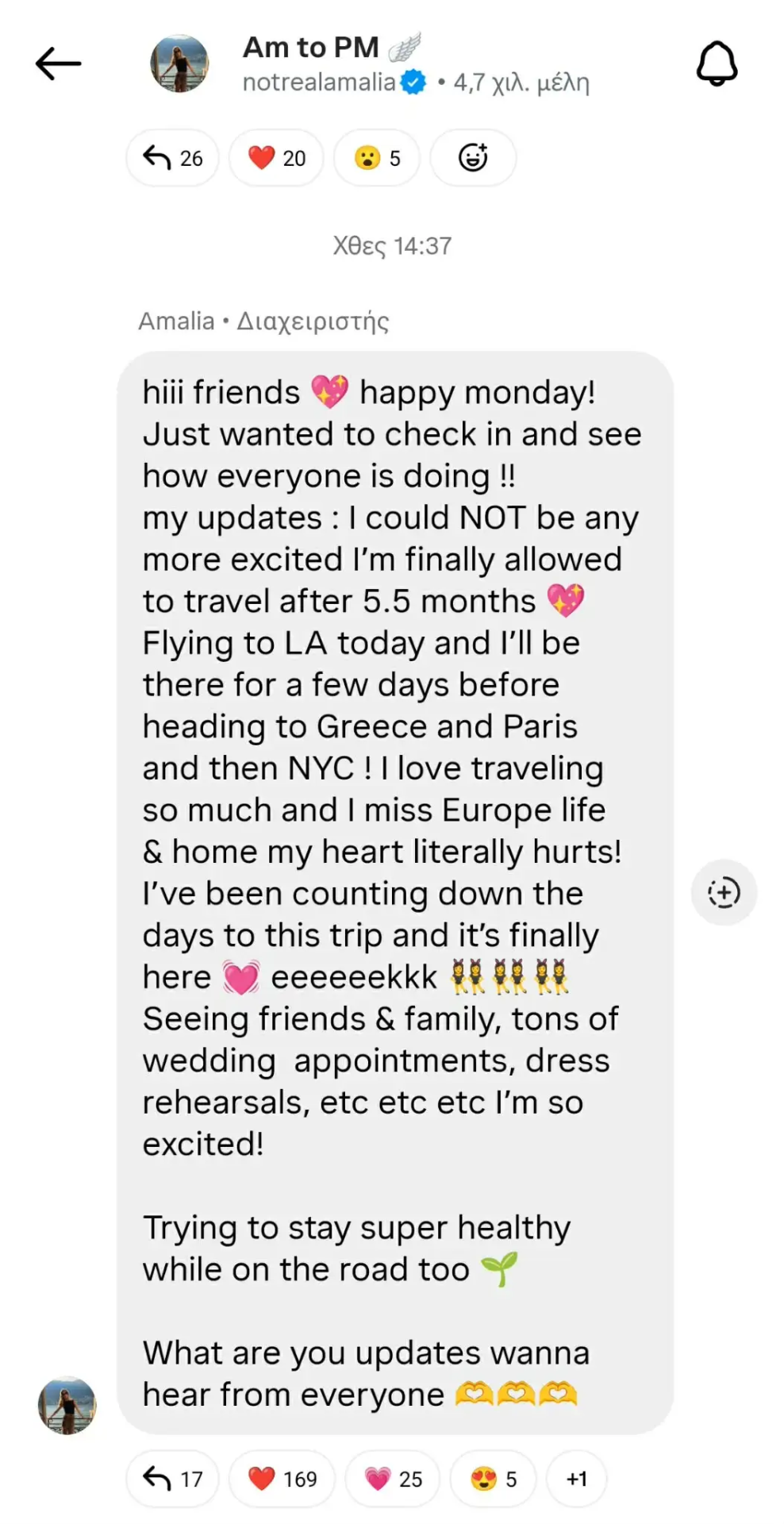 Λατρεύω τα ταξίδια και μου έχει λείψει τόσο πολύ η ζωή στην Ευρώπη και το σπίτι μου, που πραγματικά με πονάει η καρδιά μου. Μετρούσα αντίστροφα τις μέρες για αυτό το ταξίδι και επιτέλους έφτασε! Θα δω φίλους και οικογένεια, έχω πολλά ραντεβού για τον γάμο, πρόβες για το νυφικό και τόσα άλλα. Είμαι πάρα πολύ ενθουσιασμένη! Προσπαθώ επίσης να παραμείνω όσο πιο υγιής γίνεται ενώ ταξιδεύω. Πείτε μου και τα δικά σας νέα, θέλω να μάθω πώς είστε όλοι» έγραψε η Αμαλία Κωστοπούλου.