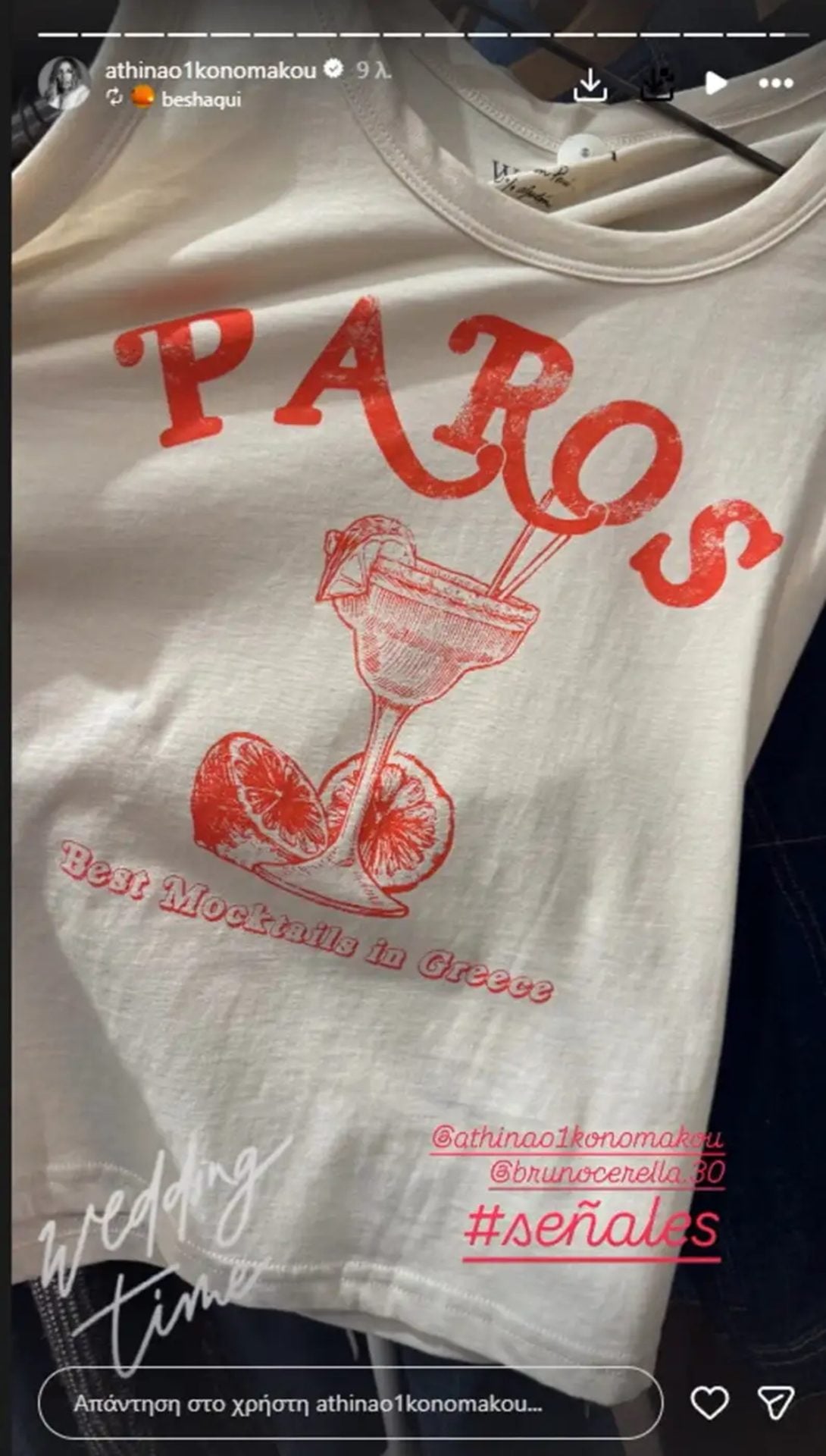 Συγκεκριμένα, η Αθηνά Οικονομάκου έκανε repost μια φωτογραφία με μπλουζάκι από την Πάρο, πάνω στο οποίο αναγραφόταν η φράση «Wedding Time». Η ανάρτηση αυτή άφησε να εννοηθεί πως η μεγάλη ημέρα πλησιάζει. Με αυτόν τον τρόπο, η ηθοποιός ουσιαστικά επιβεβαίωσε τον επικείμενο γάμο της με τον Μπρούνο Τσερέλα, παρότι το ζευγάρι επιθυμεί να κρατήσει την τελετή μακριά από τα φώτα της δημοσιότητας.