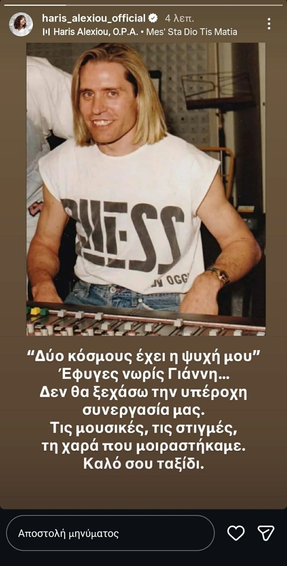Θλίψη προκάλεσε στον χώρο της ελληνικής μουσικής η είδηση του θανάτου του Γιάννη Ευσταθίου, μέλους του συγκροτήματος O.P.A., ο οποίος έφυγε από τη ζωή την Πέμπτη 12 Μαρτίου. Η Χάρις Αλεξίου, που είχε συνεργαστεί μαζί του στο παρελθόν, τον αποχαιρέτησε δημόσια μέσα από τον λογαριασμό της στο Instagram, δημοσιεύοντας ένα ιδιαίτερα συγκινητικό μήνυμα.