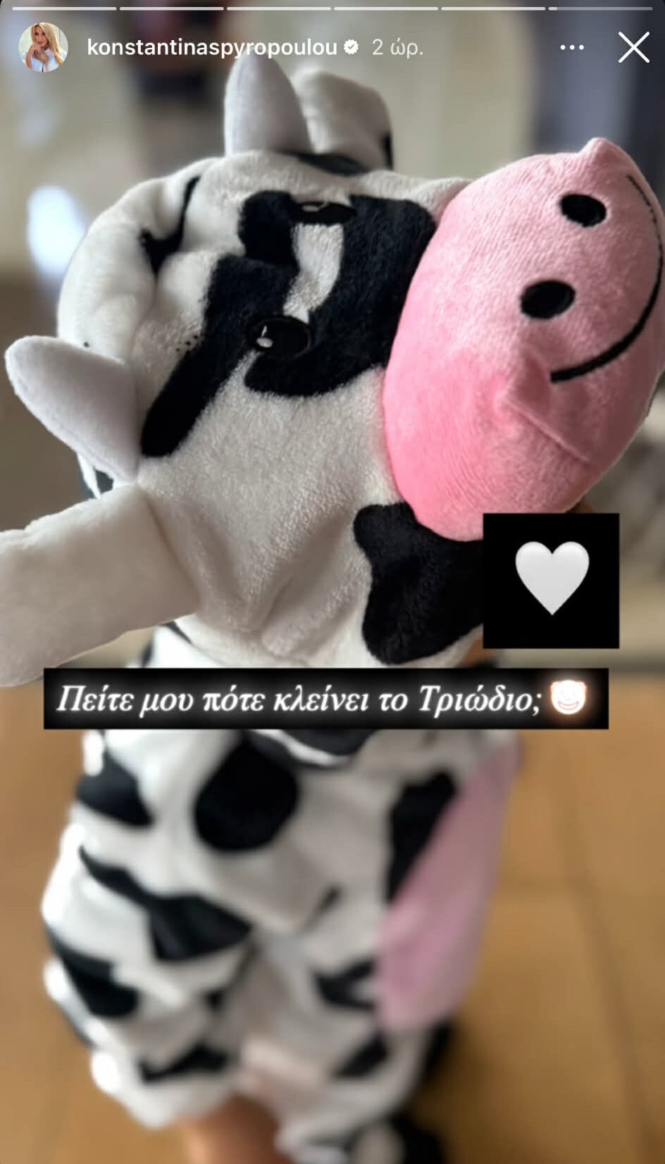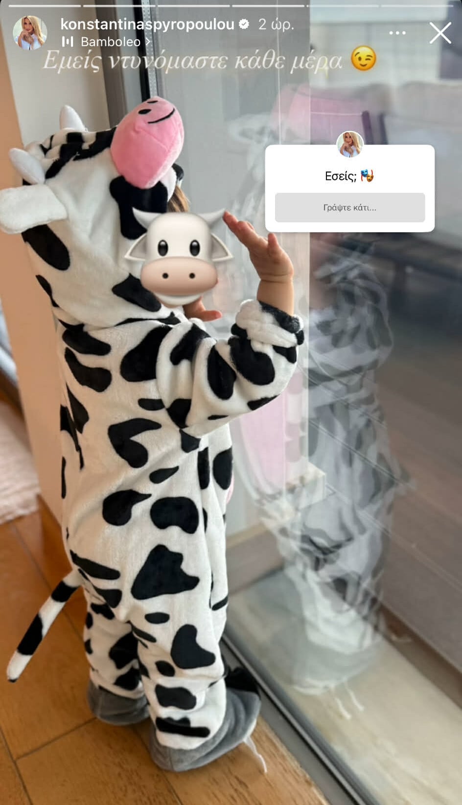 Αυτή τη φορά, ο Βασίλης εμφανίστηκε ντυμένος με στολή αγελάδας, με την παρουσιάστρια να γράφει χαρακτηριστικά: «Εμείς ντυνόμαστε κάθε μέρα».