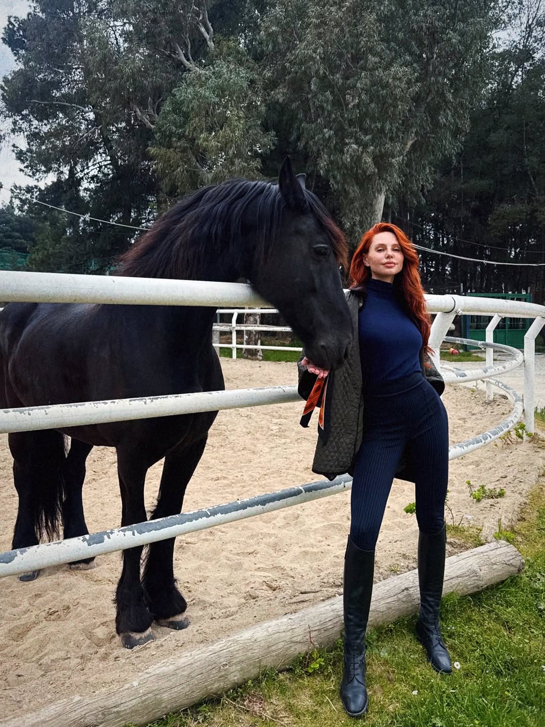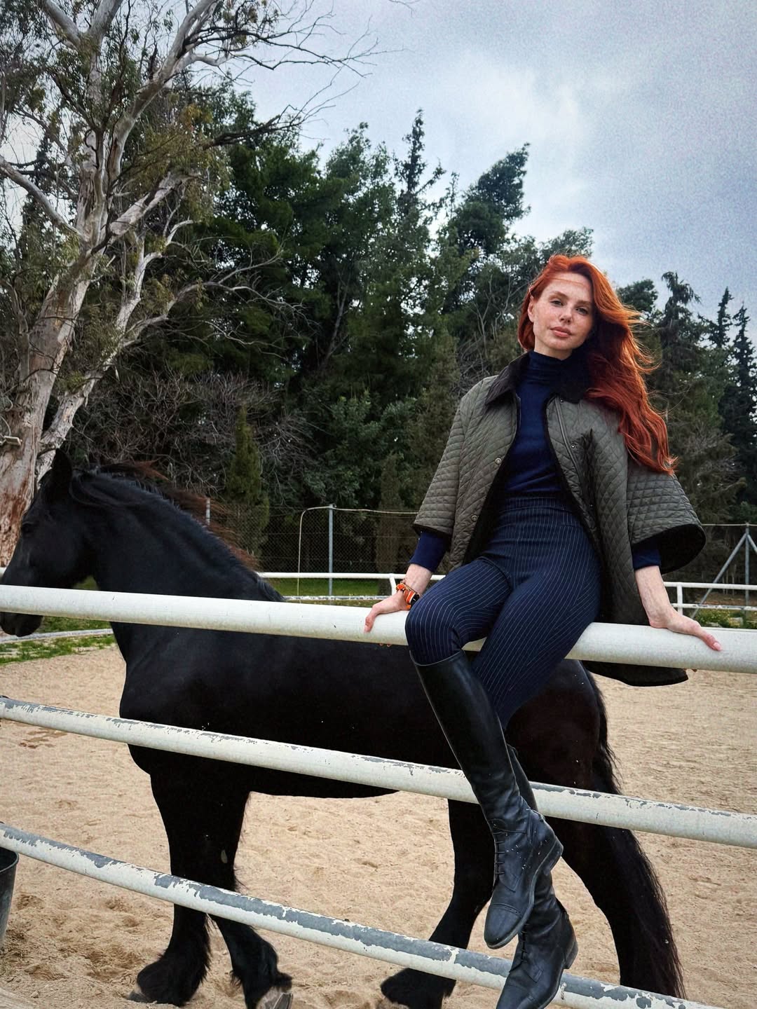Το μοντέλο βρέθηκε στον Σύνδεσμο Θεραπευτικής Ιππασίας και φωτογραφήθηκε δίπλα σε ένα επιβλητικό μαύρο άλογο, επιλέγοντας ένα blue black σύνολο που τράβηξε τα βλέμματα.