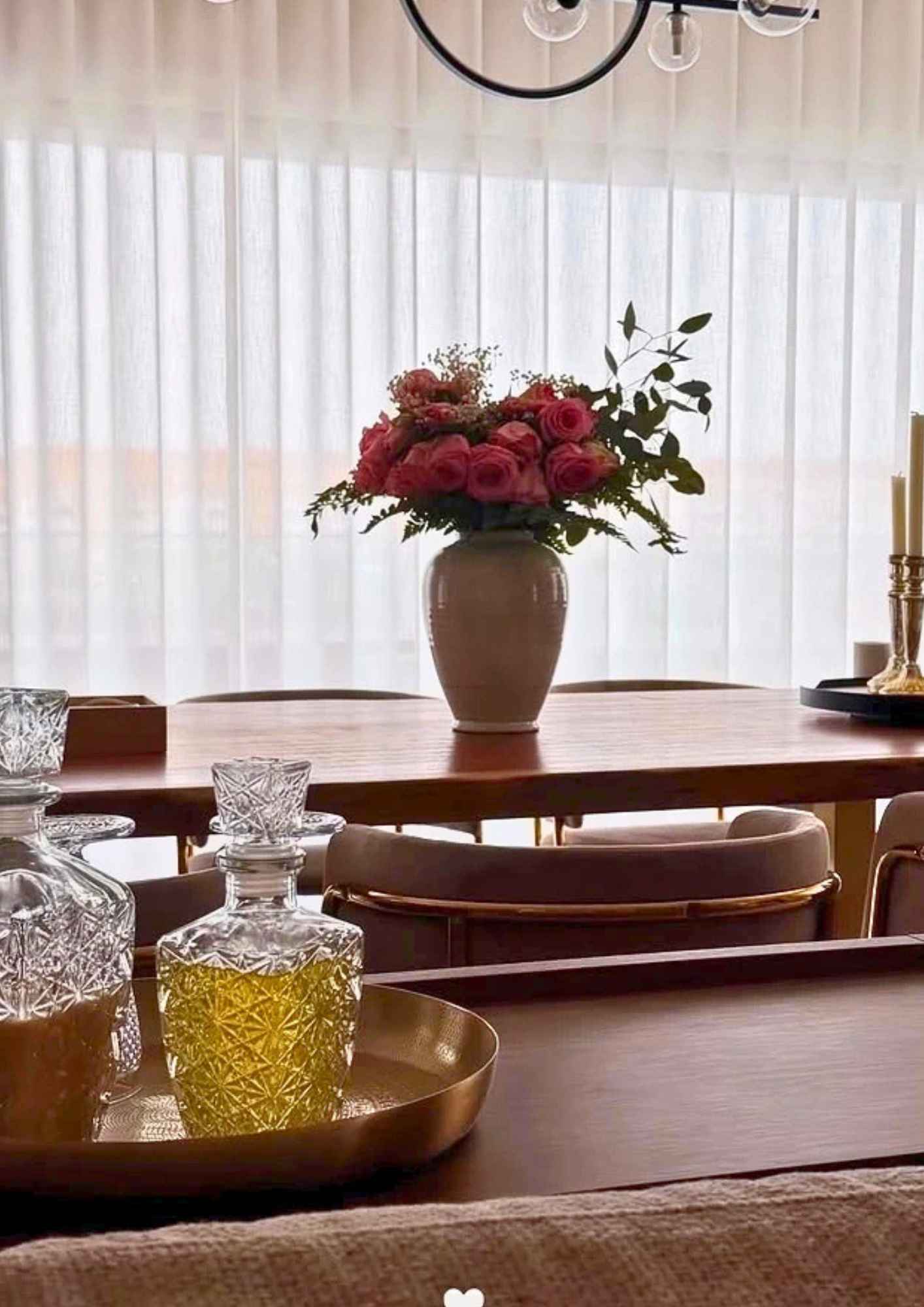 Το βλέμμα τραβά η μεγάλη τραπεζαρία με τις άνετες καρέκλες μοντέρνου σχεδιασμού, ενώ στο κέντρο του τραπεζιού ξεχωρίζει ένα λευκό βάζο με φρέσκα λουλούδια, μια λεπτομέρεια που αποτυπώνει τη φροντίδα της για έναν χώρο ζεστό, ζωντανό και με προσωπικό χαρακτήρα.