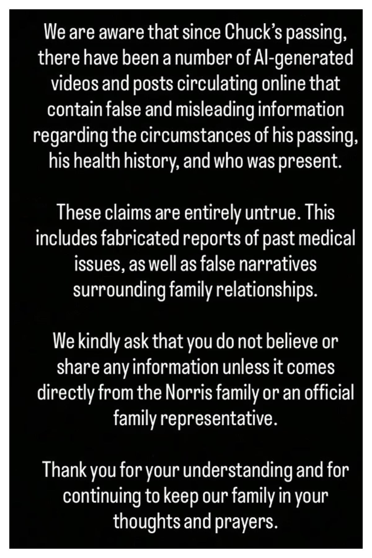 Πρόσφατα, τα οικογενειακά του πρόσωπα, δημοσίευσαν ένα μήνυμα στον λογαριασμό του Νόρις στο Instagram, ζητώντας από το κοινό, να μην πιστεύει τις αναρτήσεις και τα βίντεο AI που κυκλοφορούν, τα οποία περιέχουν «λανθασμένες και παραπλανητικές πληροφορίες» σχετικά με το ιστορικό της υγείας του, τις συνθήκες θανάτου του και τα οικογενειακά του θέματα. Όπως σημείωσαν: «Αυτές οι πληροφορίες είναι εντελώς αναληθείς. Περιλαμβάνουν ψεύτικες αναφορές για ιατρικά του θέματα, καθώς και ψευδείς ιστορίες για τις οικογενειακές τους σχέσεις».