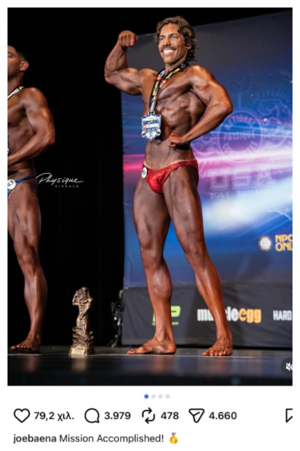 Μέσα από τον προσωπικό του λογαριασμό στο Instagram, ο Μπαένα μοιράστηκε τη χαρά του με τους ακολούθους του, δημοσιεύοντας φωτογραφίες από τον διαγωνισμό όπου ποζάρει, επιδεικνύοντας τα σωματικά του προσόντα του ενώ στη λεζάντα έγραψε χαρακτηριστικά: «Αποστολή εξετελέσθη».