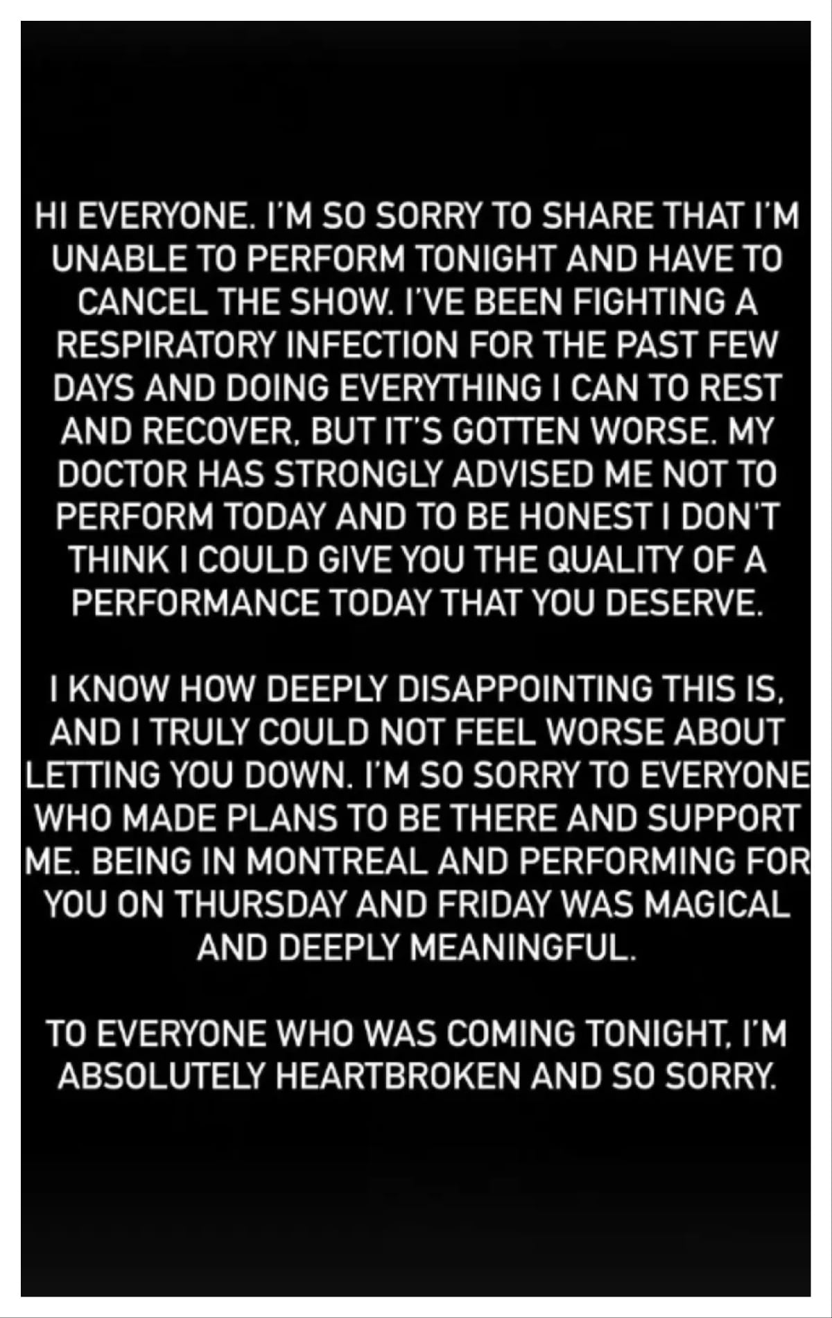 «Γεια σε όλους, λυπάμαι πολύ που σας ενημερώνω ότι δεν μπορώ να εμφανιστώ απόψε και πρέπει να ακυρώσω τη συναυλία. Τις τελευταίες ημέρες παλεύω με μια αναπνευστική λοίμωξη και κάνω ό,τι μπορώ για να ξεκουραστώ και να αναρρώσω. Όμως η κατάστασή μου χειροτέρεψε. Ο γιατρός μου με συμβούλεψε να μην εμφανιστώ σήμερα και, για να είμαι ειλικρινής, δεν νομίζω ότι θα μπορούσα να σας προσφέρω την ποιότητα της εμφάνισης που αξίζετε» και συμπλήρωσε: «Ξέρω πόσο απογοητευτικό είναι αυτό. Και πραγματικά δεν θα μπορούσα να νιώθω χειρότερα που σας απογοητεύω. Λυπάμαι πολύ για όλους όσοι έκαναν σχέδια να είναι εκεί και να με στηρίξουν. Το να βρίσκομαι στο Μόντρεαλ και να εμφανίζομαι για εσάς την Πέμπτη και την Παρασκευή ήταν μαγικό και βαθιά σημαντικό για μένα. Για όποιον θα ερχόταν σήμερα στο live είμαι απόλυτα συντετριμμένη και λυπάμαι τόσο».