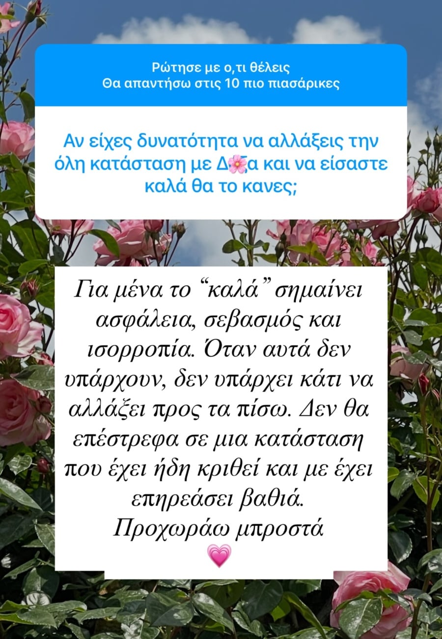Μέσα από τον προσωπικό της λογαριασμό στο Instagram, ένας ακόλουθος της έθεσε το ερώτημα που πολλοί σκέφτονταν: «Αν μπορούσες να αλλάξεις όσα έγιναν και να είστε καλά με τον Δόξα, θα το έκανες;». Η απάντησή της ήταν άμεση και χωρίς περιστροφές. Η Μαρία Δεληθανάση δεν άφησε κανένα περιθώριο παρερμηνείας: «Για μένα το “καλά” σημαίνει ασφάλεια, σεβασμός και ισορροπία. Όταν αυτά δεν υπάρχουν, δεν υπάρχει κάτι να αλλάξει προς τα πίσω. Δεν θα επέστρεφα σε μια κατάσταση που έχει ήδη κριθεί και με έχει επηρεάσει βαθιά. Προχωράω μπροστά».