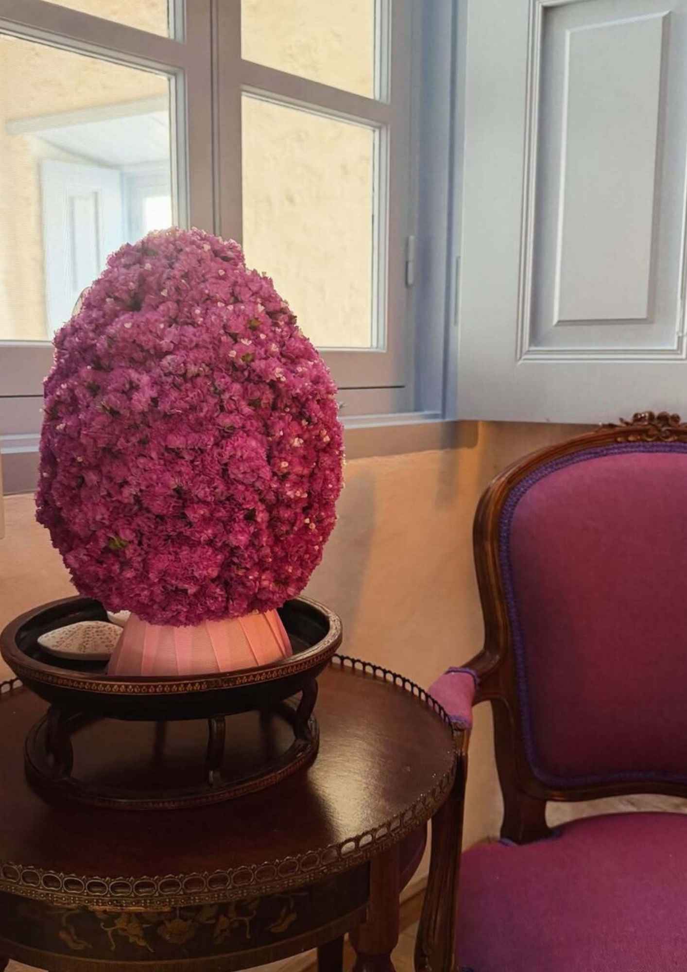 Το βλέμμα τραβά και μια ξεχωριστή ανθοσύνθεση σε σχήμα αβγού, φτιαγμένη από μπουκαμβίλιες, που έχει τοποθετηθεί σε τραπεζάκι του σπιτιού.