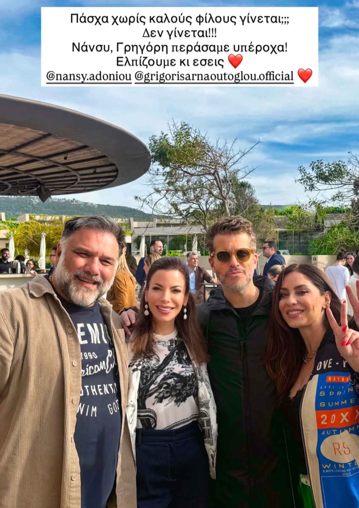 Η Αντελίνα Βαρθακούρη έγραψε στην ανάρτησή της: «Πάσχα χωρίς καλούς φίλους γίνεται; Δεν γίνεται! Νάνσυ, Γρηγόρη περάσαμε υπέροχα, ελπίζουμε κι εσείς».