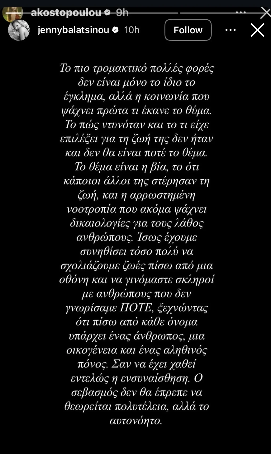 Μέσα από ανάρτησή της, στάθηκε όχι μόνο στο ίδιο το τραγικό γεγονός, αλλά και στον τρόπο με τον οποίο συχνά αντιμετωπίζονται τέτοιες υποθέσεις. «Το πιο τρομακτικό πολλές φορές δεν είναι μόνο το ίδιο το έγκλημα, αλλά η κοινωνία που ψάχνει πρώτα τι έκανε το θύμα», έγραψε χαρακτηριστικά.
