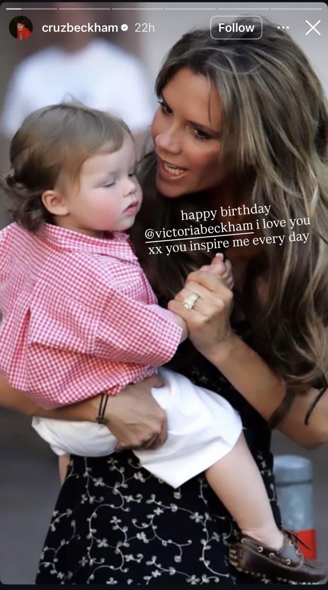 Ο γιος της, Κρουζ Μπέκαμ, επέλεξε να της ευχηθεί μέσα από τα social media, δημοσιεύοντας μια φωτογραφία από τα παιδικά του χρόνια, όπου βρίσκεται στην αγκαλιά της μητέρας του.